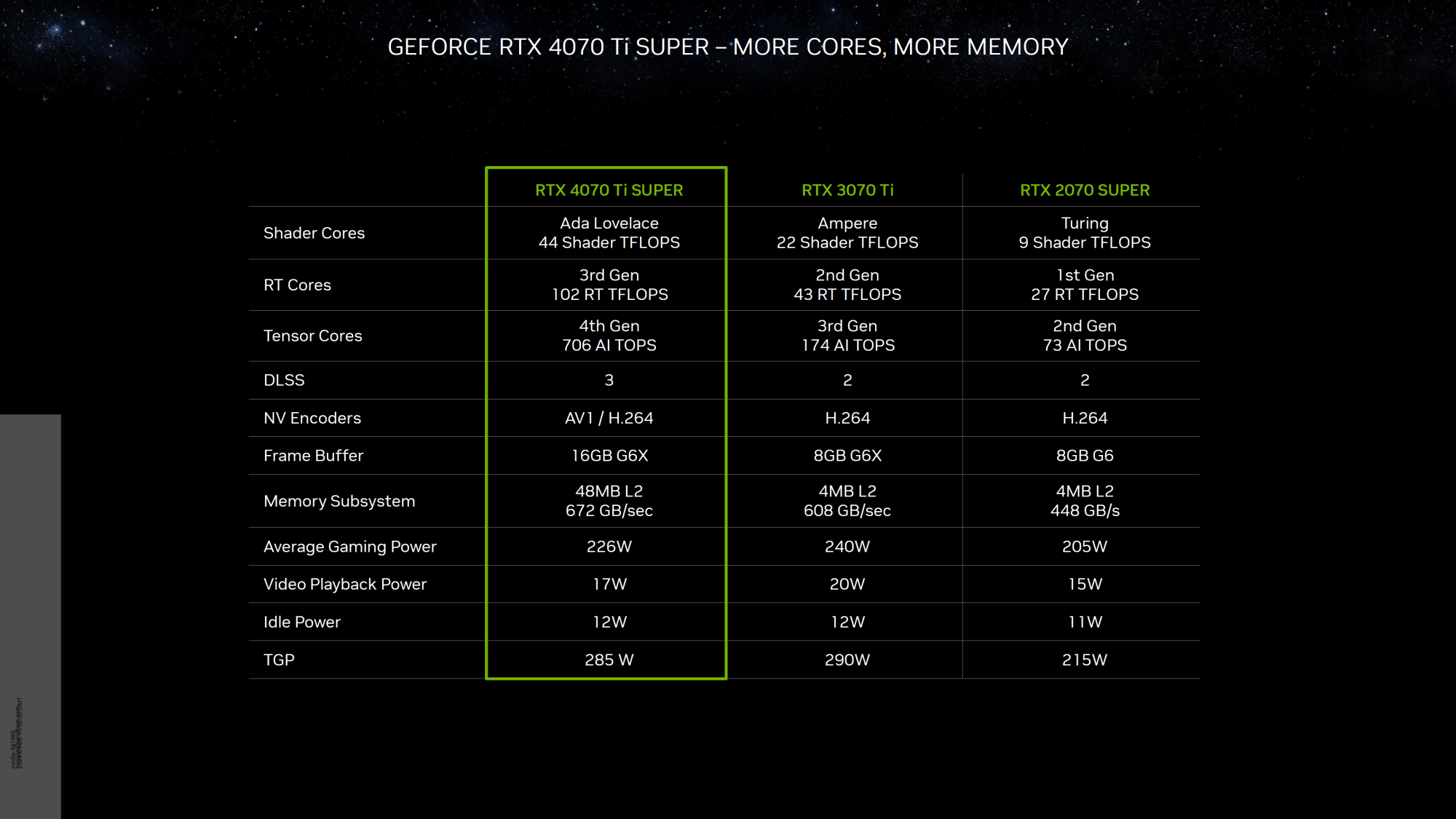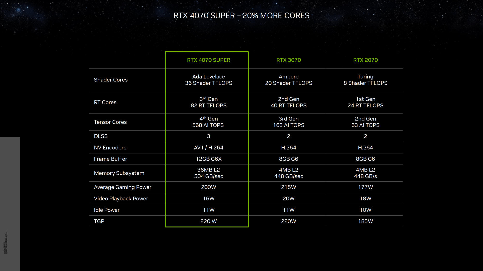 GeForce RTX 4070 Super este conform Nvidia cu 15% mai rapidă decât varianta non Super și mai performantă decât un RTX 3090. Este echipată cu 12GB memorie GDDR6X și un bus de memorie pe 192 biți.