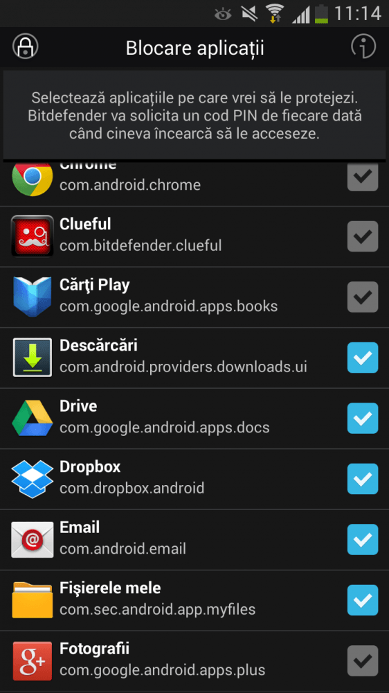 App Lock afiseaza o lista cu aplicatii instalate si permite utilizatorilor sa ia masuri de precautie suplimentare restrictionand accesul la acele aplicatii care ar putea provoca cheltuieli nedorite sau care ar putea afecta intimitatea utilizatorului. Oricine foloseste dispozitivul va trebui sa introduca codul Bitdefender pentru a accesa acele aplicatii.