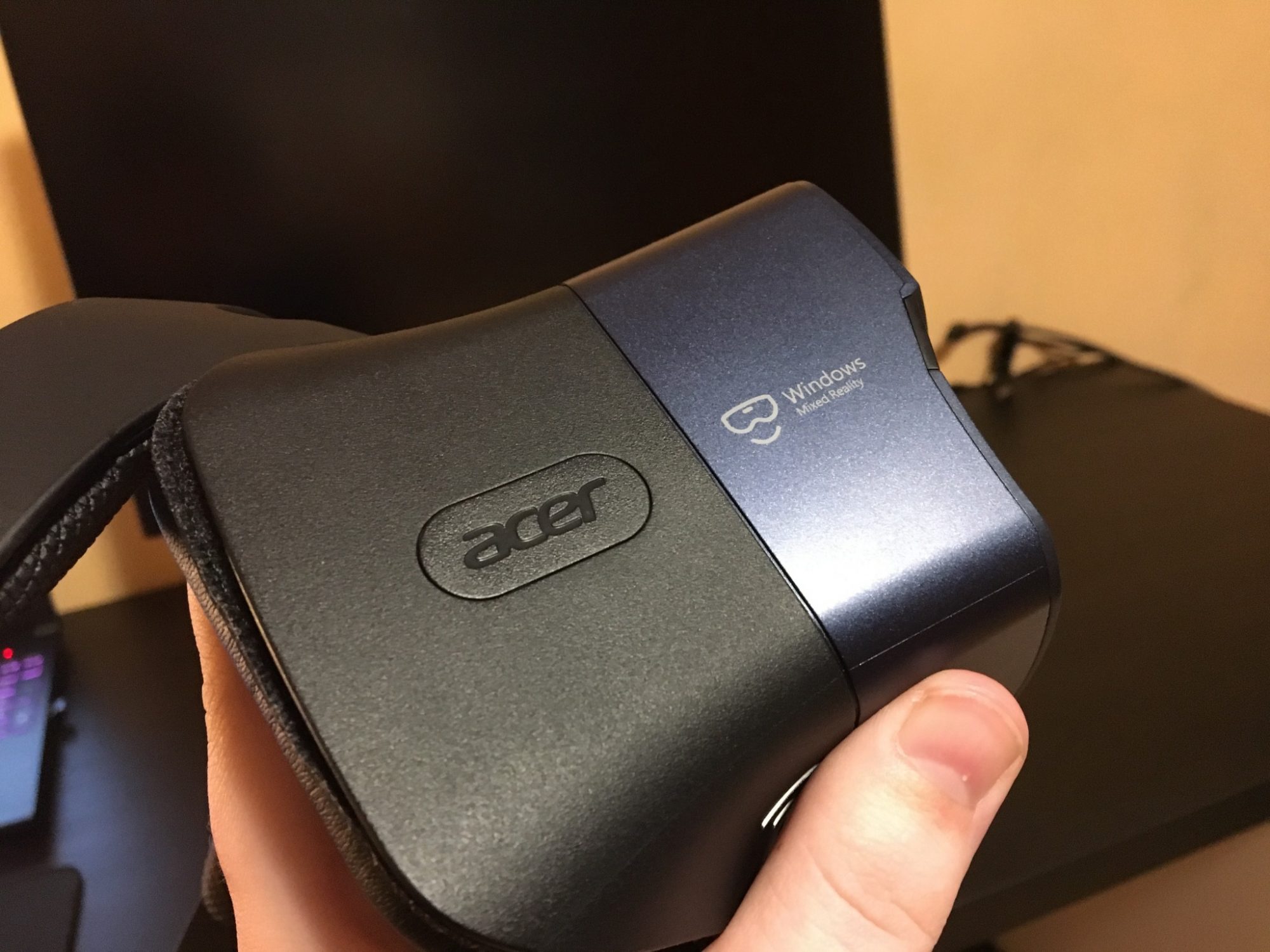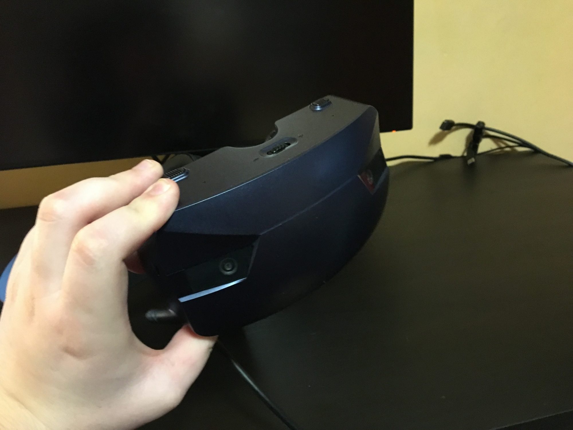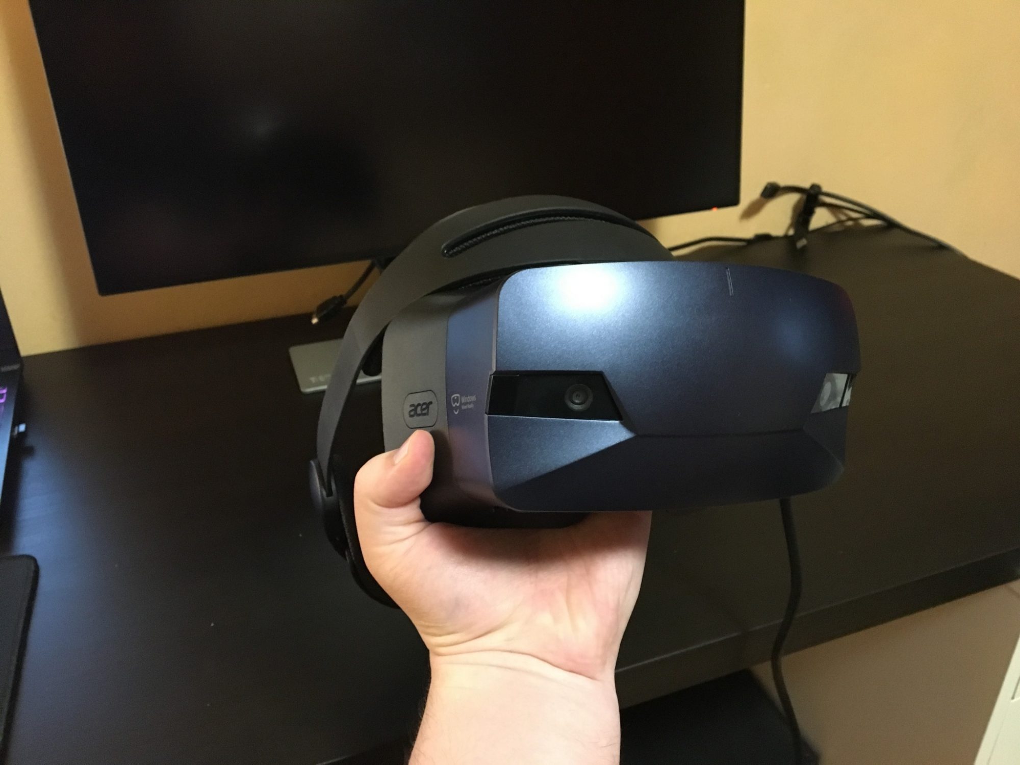 Conectarea la PC se realizeaza prin HDMI si USB 3.0. Problema este cum a decis Acer sa amplaseze cablul pe casca. Acesta iese din coltul din stanga sus si il simti atunci cand folosesti casca. Este destul de greu, il atingi si devine enervant.