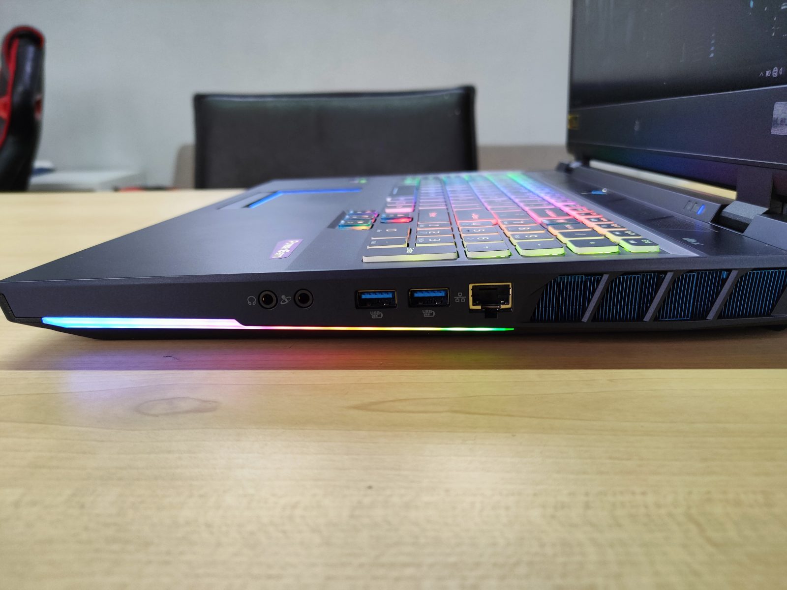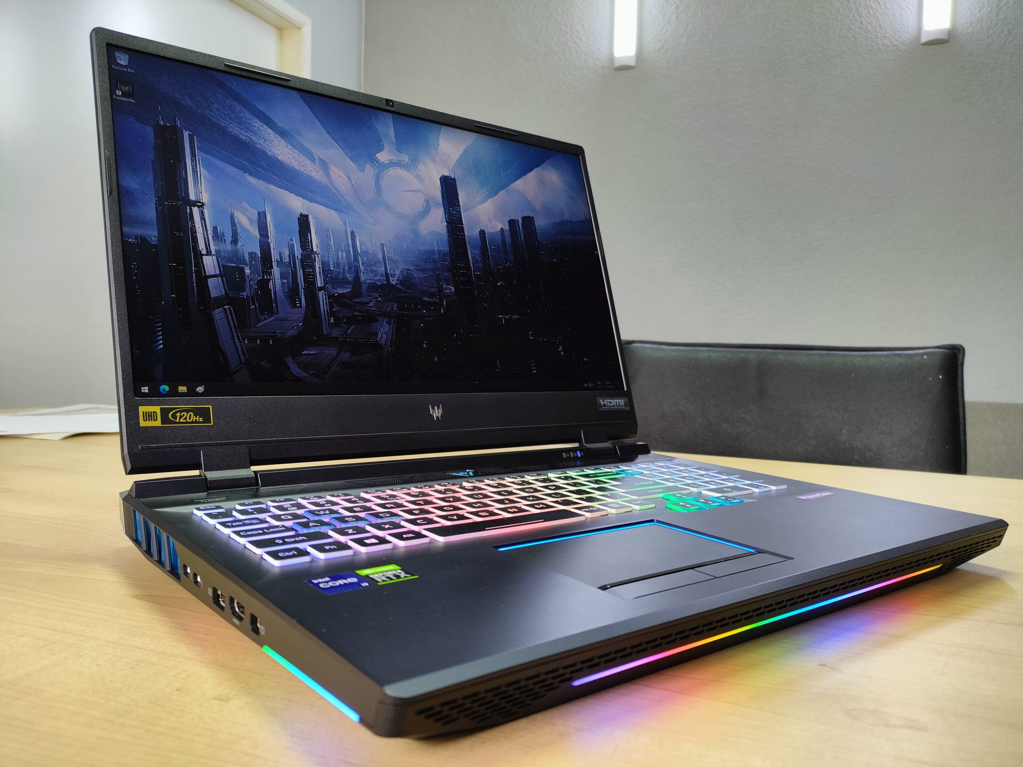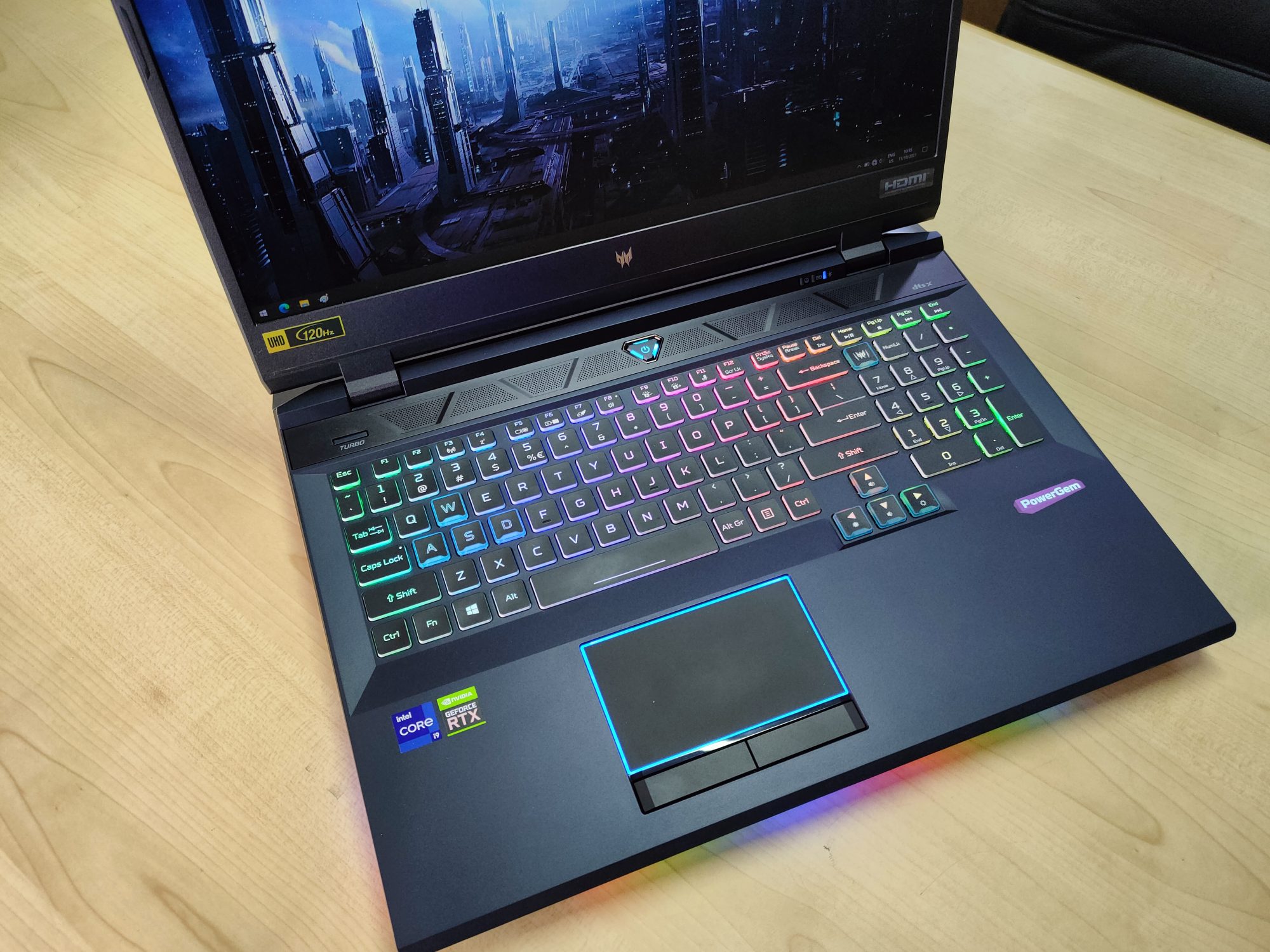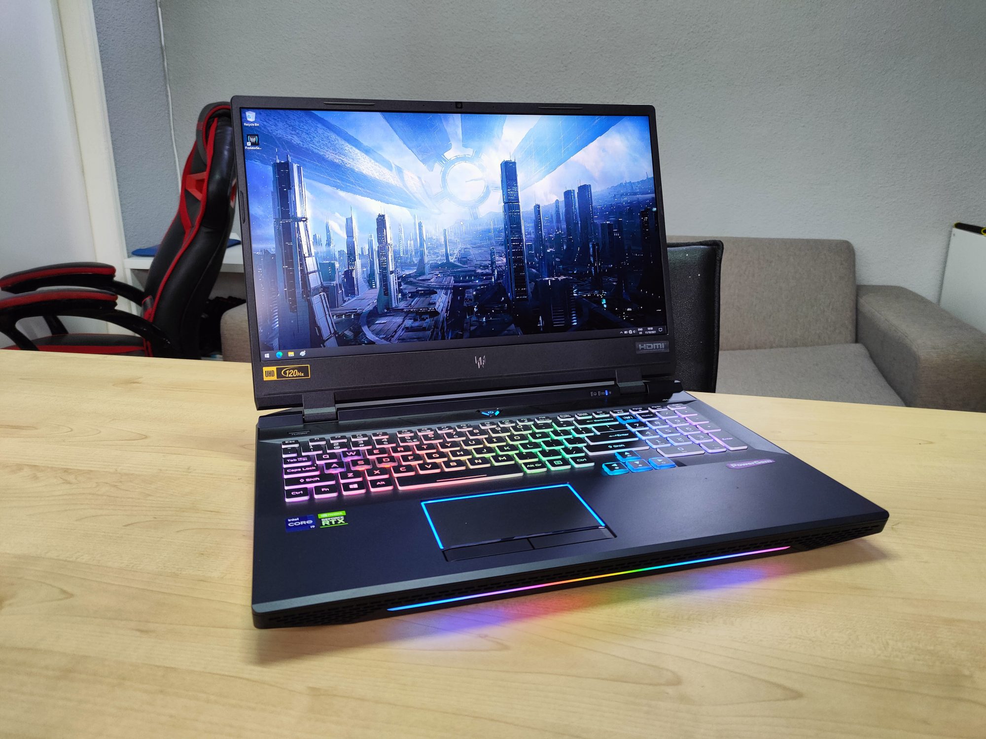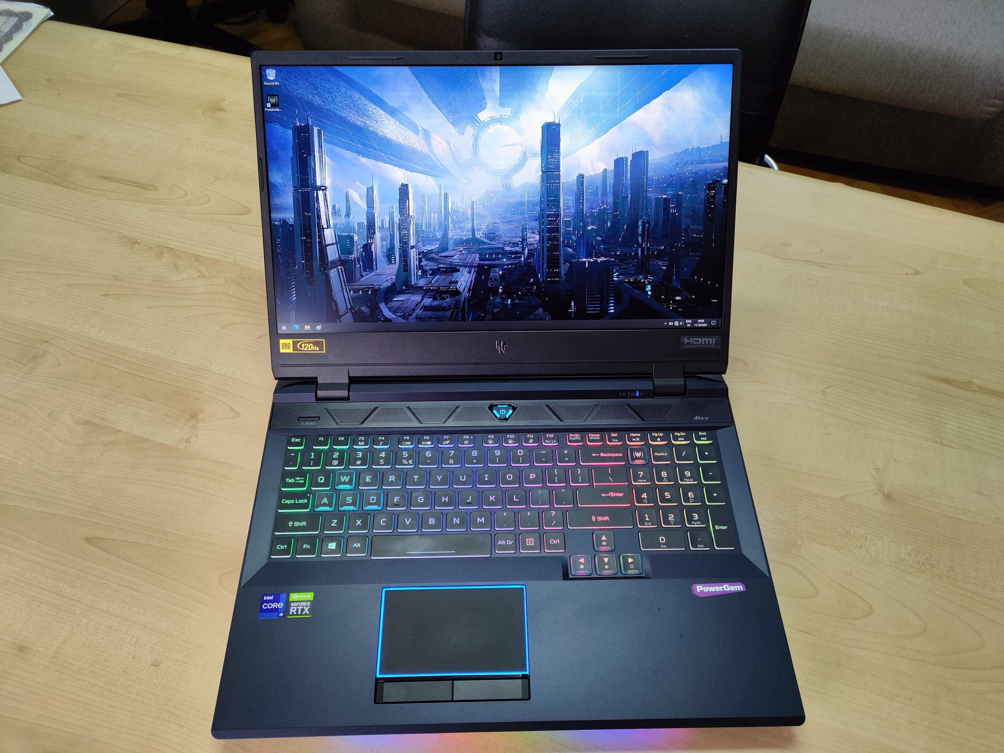 La interior gasim un procesor din generatia 11, un Core i9-11980H la 2.6GHz, 32GB RAM si o placa video RTX 3080. Ecranul este 3840 x 2160 pixeli la 120Hz, complet mat, iar design-ul este unul de top.