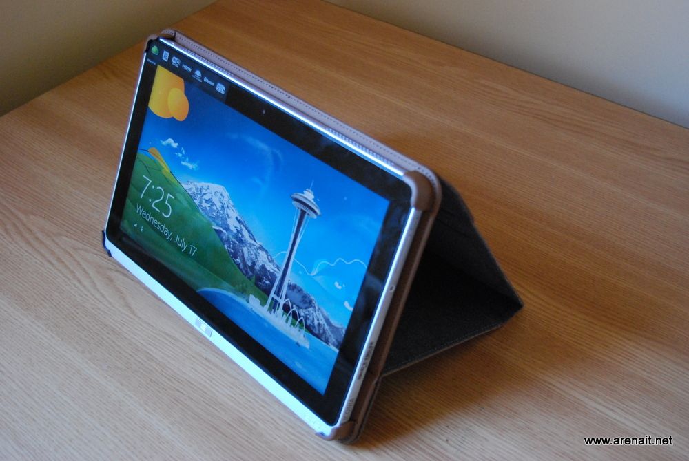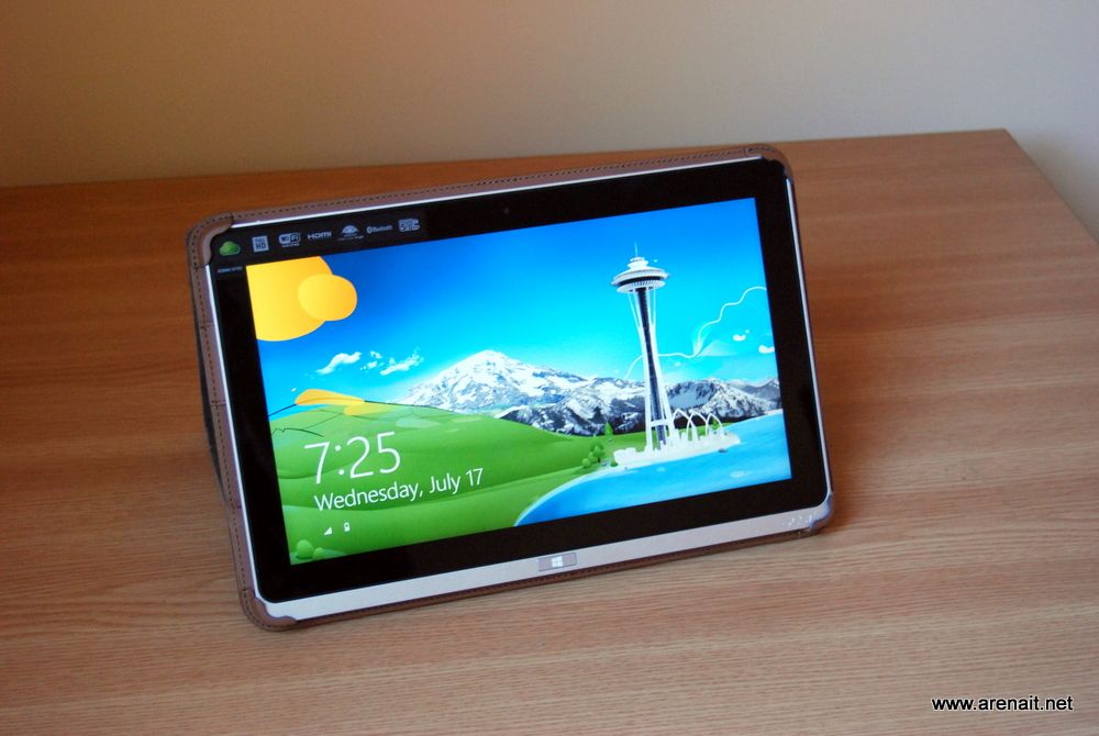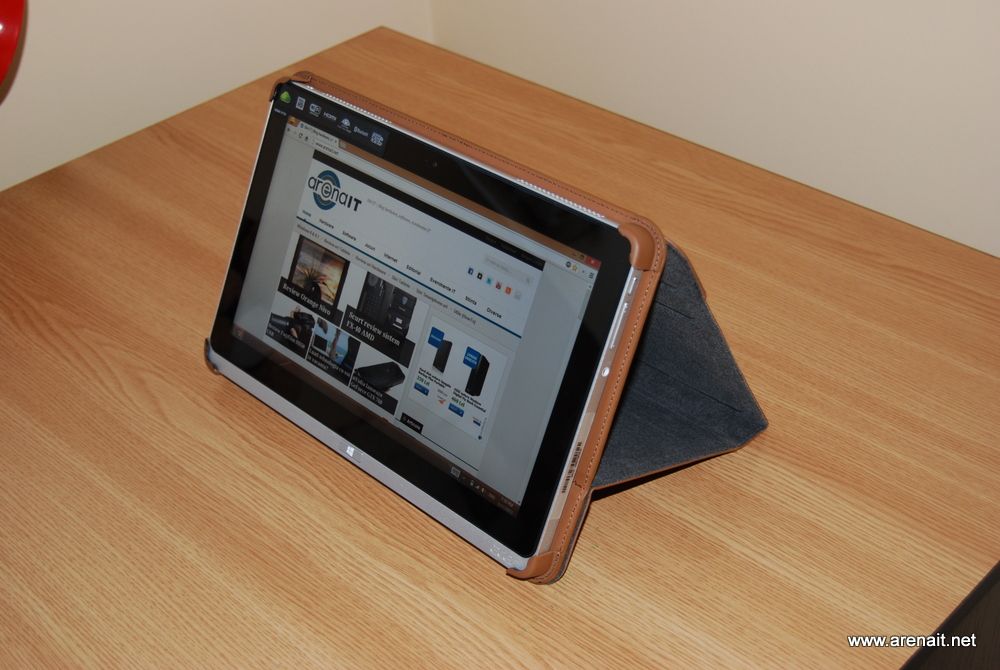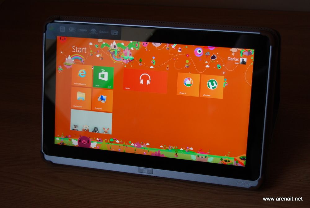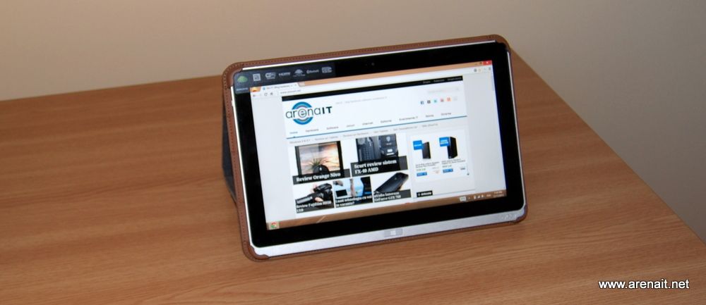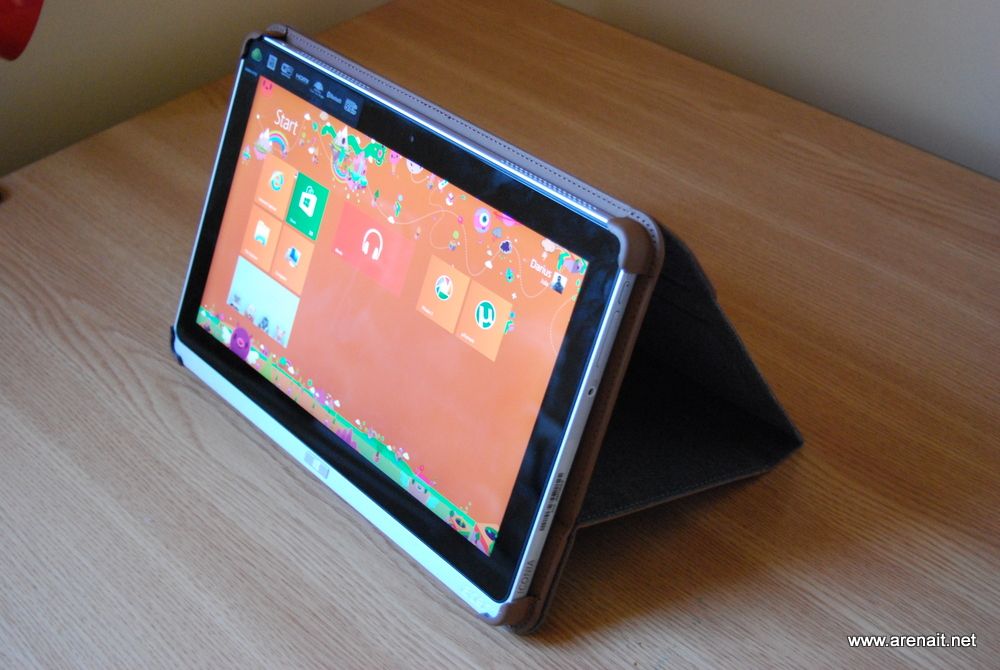 Cum ziceam, tableta vine cu Windows 8. Sub capota are un Intel Core i3 (exista si o varianta cu Core i5), un SSD si 4 GB memorie RAM, suficient ca sistemul de operare sa zburde fericit. Si chiar o face. Spre exemplu, pornirea dureaza undeva la 2-3 secunde, fie ca e in sleep sau e oprita.