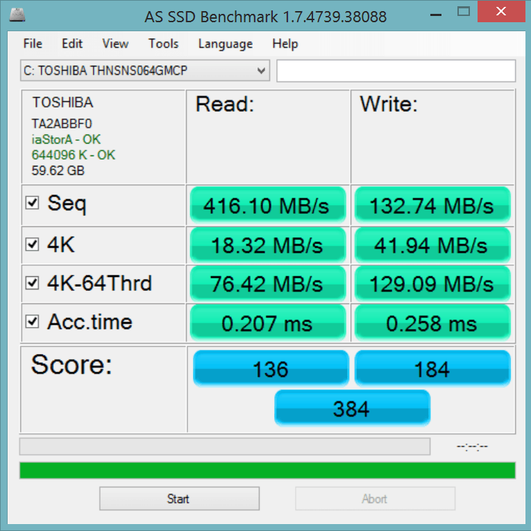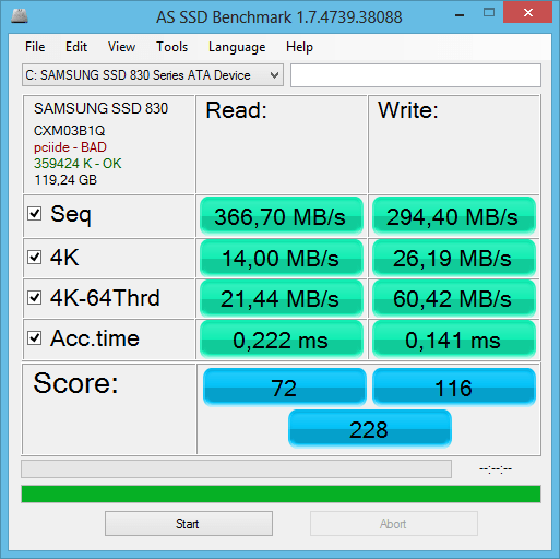 SSD-ul de pe echiparea primata avea doar 64 GB, cam micut, un 128 ar fi fost mai bine. Cu toate acestea s-a comportat bine la capitolul viteza, un test de scriere vedeti mai jos. N-ar fi stricat nici un cititor de carduri, chiar deloc.