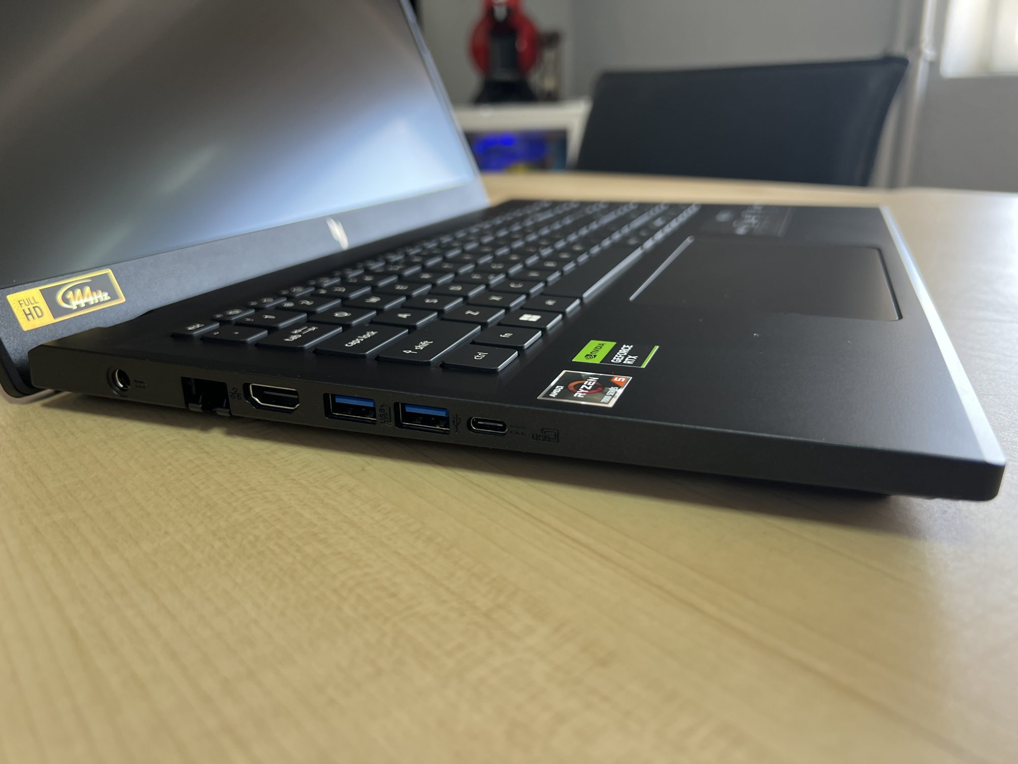 Ecranul de 15,6 inch IPS cu rezoluție FHD (1920×1080) și o rată de refresh de 144Hz oferă imagini clare și detaliate, ideale pentru divertisment, dar mai ales pentru gaming. Tehnologia IPS asigură unghiuri de vizualizare largi și culori precise, iar marginea subțire a ecranului maximizează spațiul de lucru și conferă laptopului un aspect modern și elegant. Nu este cel mai luminos ecran, însă pentru o utilizare la interior este mai mult decât suficient. În plus, la 15,6 inch este destul de compact și poate fi mai ușor de transportat.