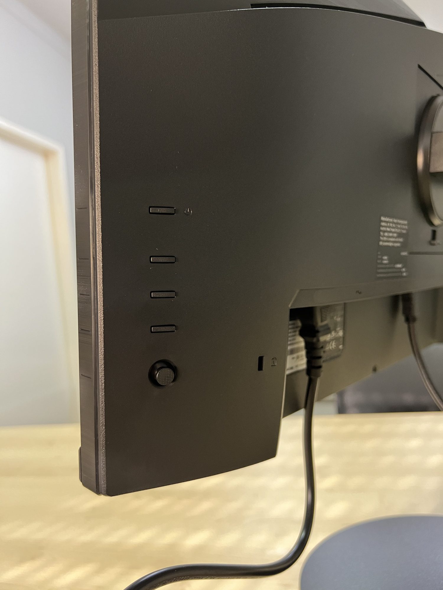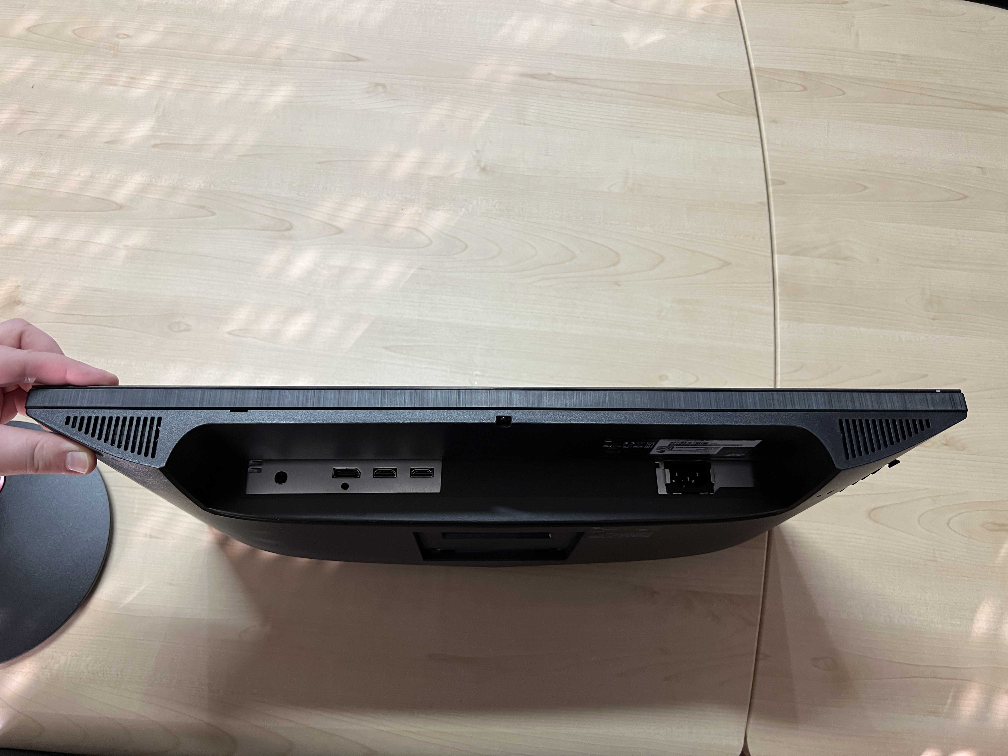 Pe partea de conectica dispune de 2x HDMI, 1x DP, 1x jack audio si atat. Alimentarea este pe cablu normal de PC, sursa lui fiind de la interior. Cumva e bine ca nu ai un transformator pe jos care sa te incurce, dar si in caz ca se arde trebuie desfacut tot monitorul.