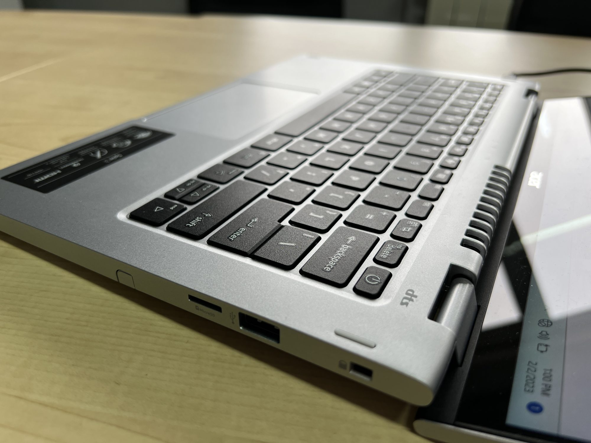 Cum spuneam, foloseste un sasiu metalic, deci este rezistent. Cu toate astea nu este foarte greu, desi nu mi se pare foarte confortabil de utilizat in modul tableta si tinut cu o singura mana. Are marginile drepte si parte foarte familiar. Fantele pentru aerisire sunt mari si acestea vor asigura un flux de aer foarte bun in orice pozitie.