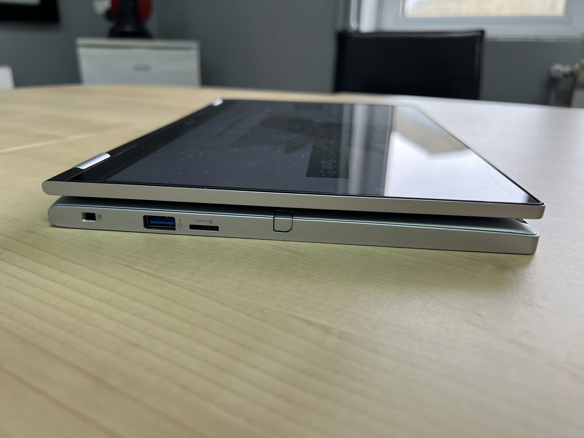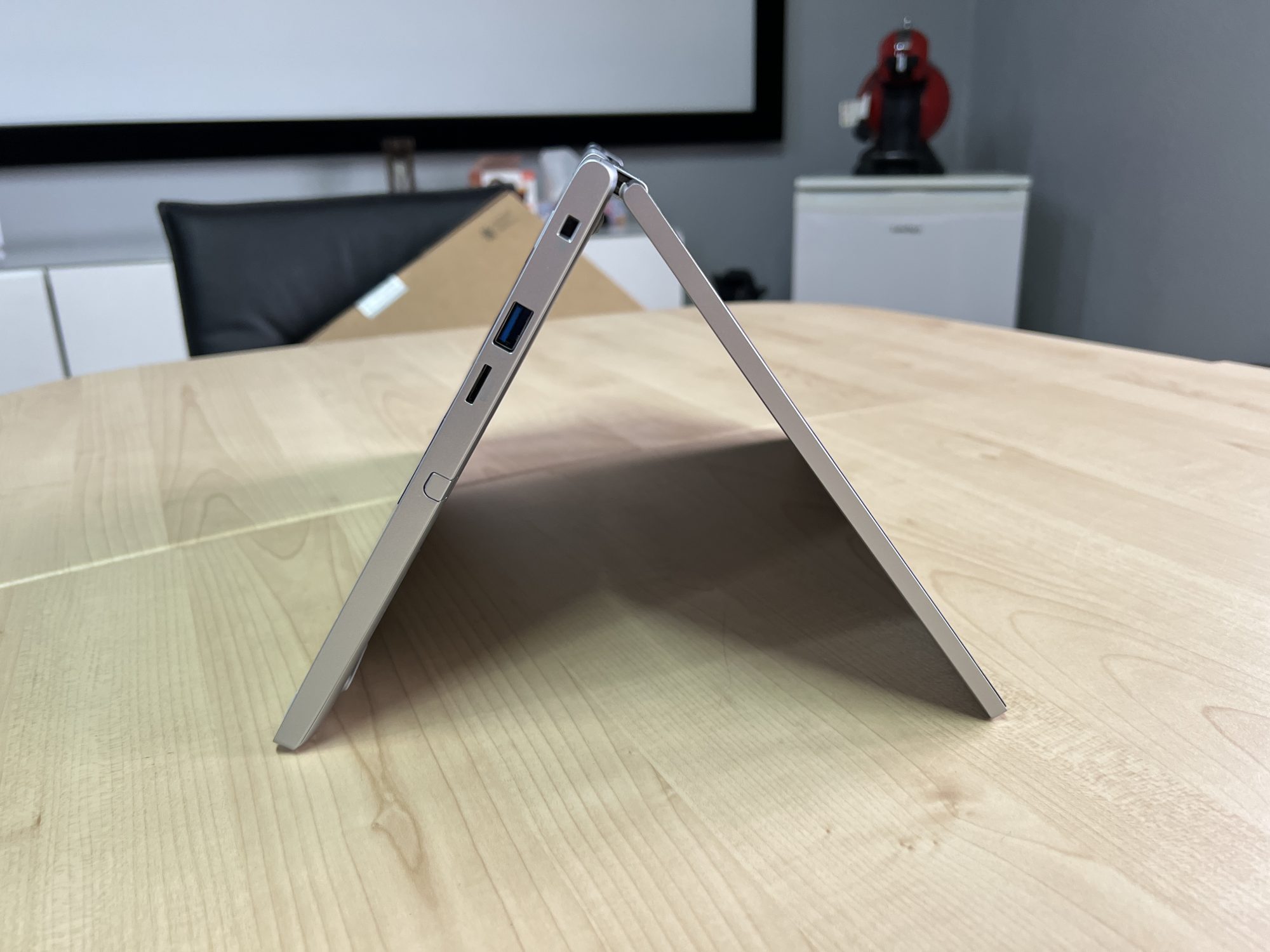 Acest laptop este construit pe un sasiu metalic, subtire, si foloseste niste balamale care ii permit ecranului sa se rabateze. Astfel, laptop-ul poate fi asezat in mai multe pozitii dupa cum o sa vedeti mai jos. Are si un stylus cu tehnologie Wacom pentru cei care vor sa deseneze sau sa interactioneze cu ajutorul lui, o autonomie pana la 13 ore si un procesor destul de capabil.