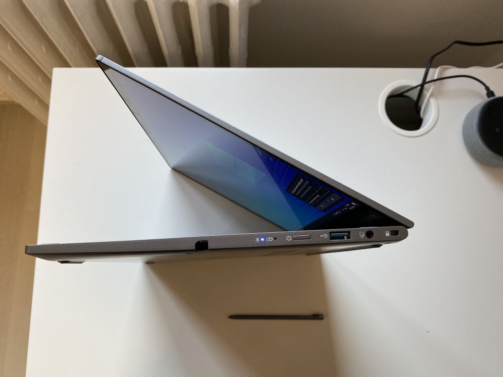 Fiind si o tableta in acelasi timp o sa regasim cateva elemente distinctive. De exemplu pe partea dreapta o sa regasim o mufa pentru casti, un port USB 3.0, butonul de power exact ca la un telefon mobil sau o tableta, LED-uri pentru baterie si stylus-ul.