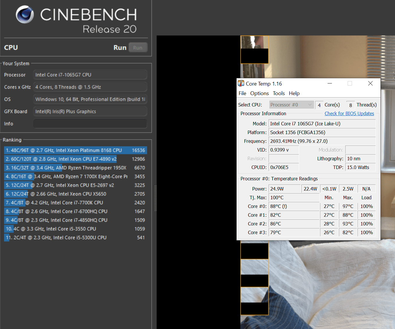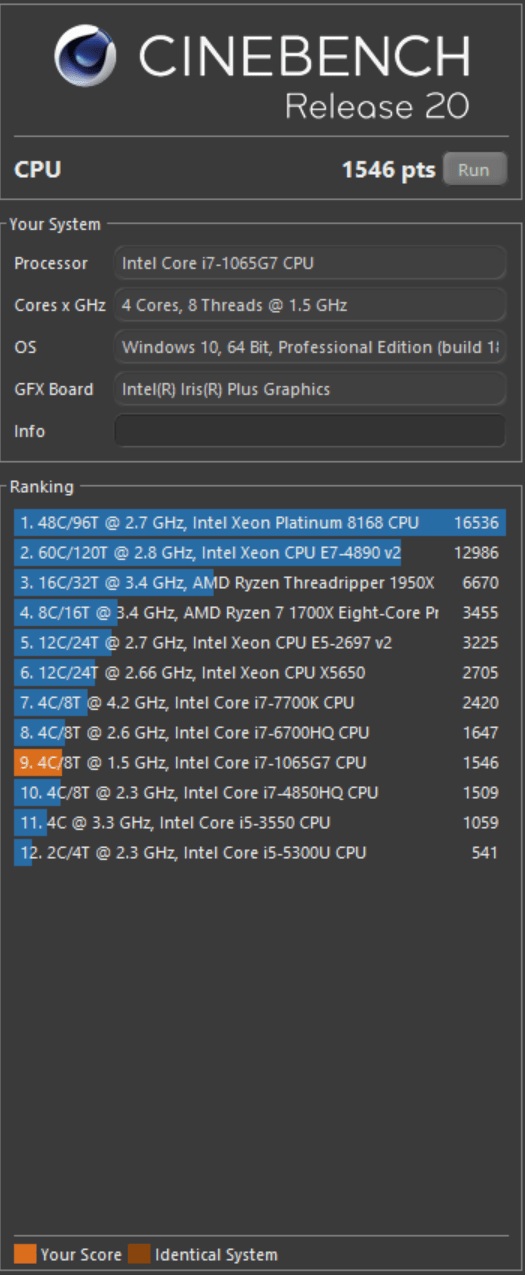 Astfel, procesorul este un Intel Core i7-1065G7 la 1.3 – 1.5GHz, 16GB RAM, SSD de 480GB in format M.2, placa video Intel Iris Plus. Cu o astfel de configuratie poti sa realizezi orice task si sa ai si o autonomie foarte buna. Procesorul a scos 1546 de puncte in R20, iar temperatura in full load pret de 10 minute nu a depasit 97 de grade. Temperatura a fost obtinuta intr-un benchmark, insa in realitate nu o sa stea niciodata atat de cald.