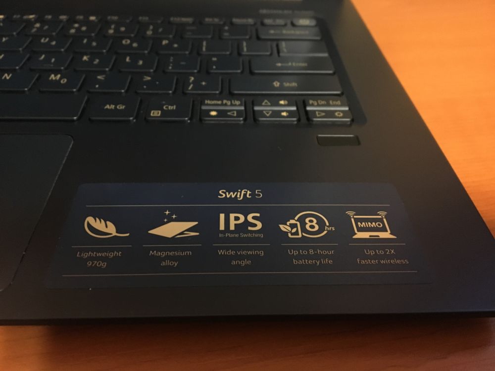 Swift 5 este un laptop care te atrage in primul rand prin design. Este construit din plastic subtire dar cu un feeling premium. Este unul dintre cele mai usoare latop-uri pe care le-am testat, sub 1 kg greutate.