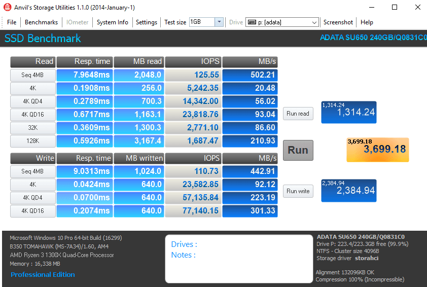 ADATA SU650 este un SSD pe care il puteti gasi la PC Garage si costa 300 lei. La banii astia primesti o capacitate de stocare de 240GB, un controller Marvell si o durata de viata de 2 milioane de ore. Este un SSD construit cu memorii 3D Nand si ofera viteze pe hartie de 520MB/s la citire si 450MB/s la scriere. In realitate lucrurile sunt asa cum vedeti in pozele de mai jos.