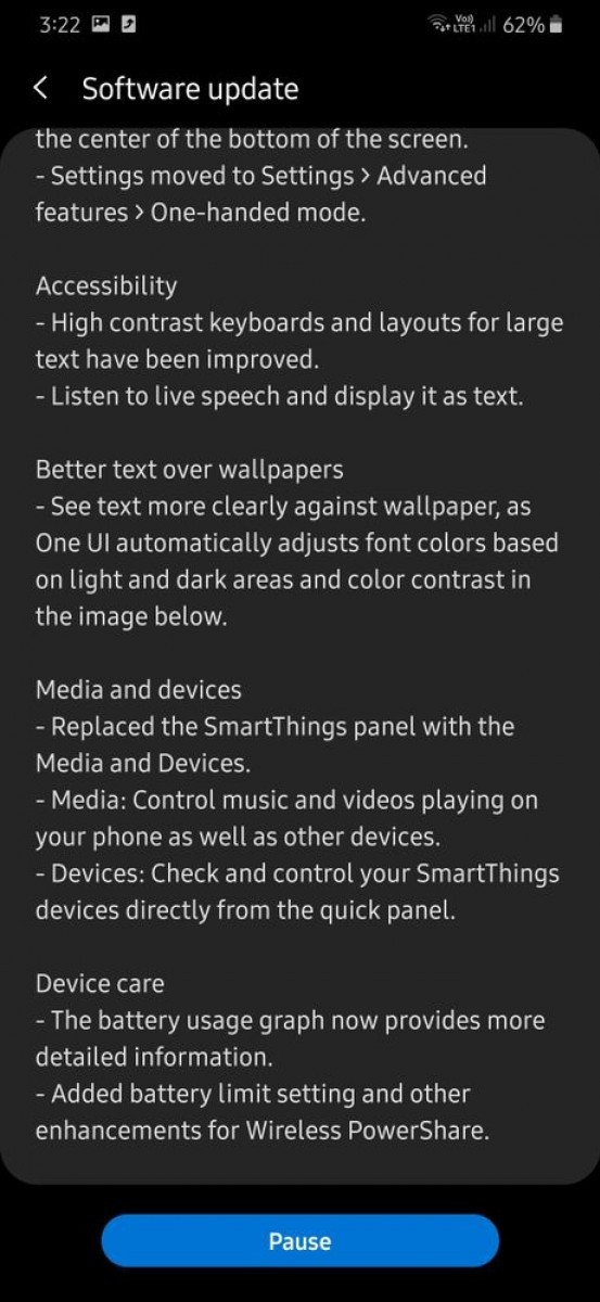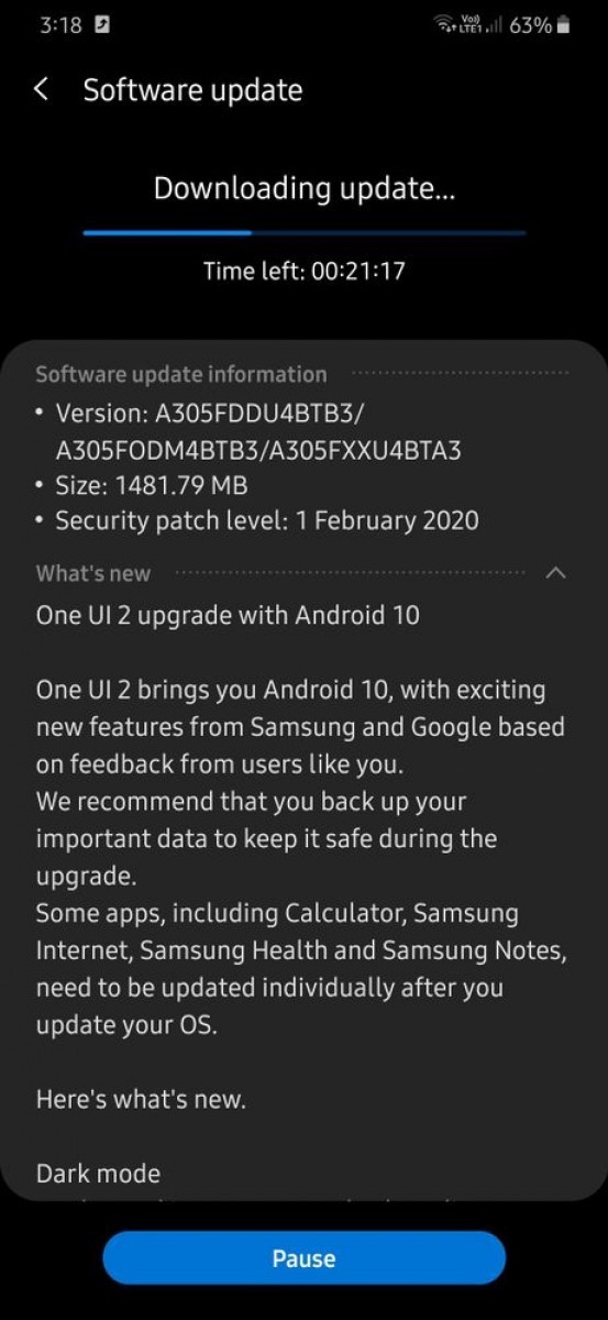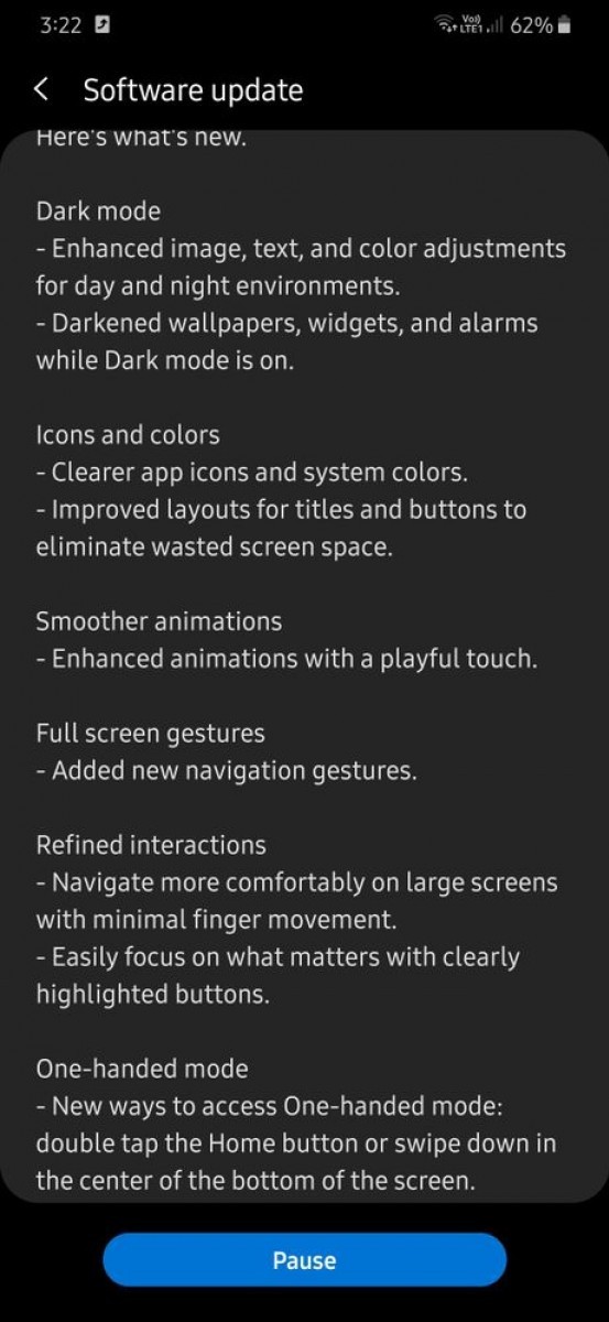 Android 10 aduce interfata simplificata One UI 2.0, dark mode, animatii si navigatie prin gesturi imbunatatite, patch-uri de securitate si altele. Update-ul are 1.4GB.