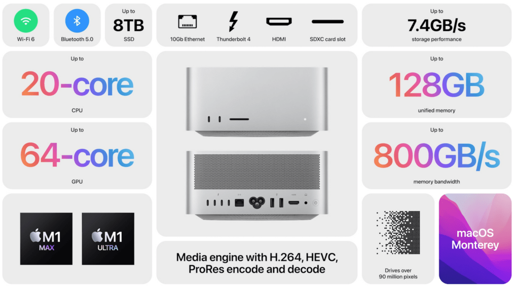 Are Wi-Fi 6, Bluetooth 5.0, pana la 8TB de SSD, port LAN de 10Gb, Thunderbolt 4, HDMI, slot SDXC si poate fi configurat atat cu procesorul M1 Max cat si cu M1 Ultra.