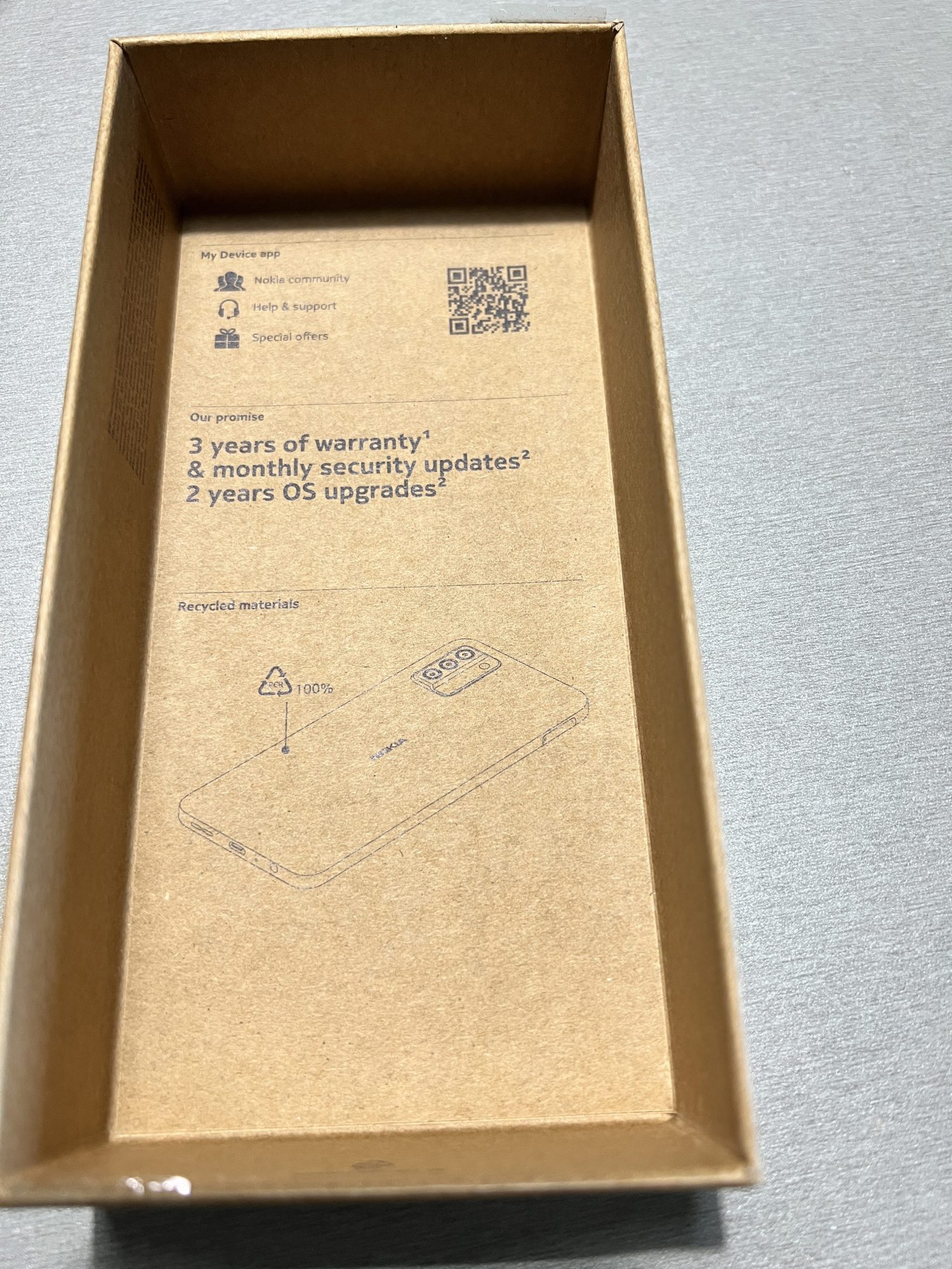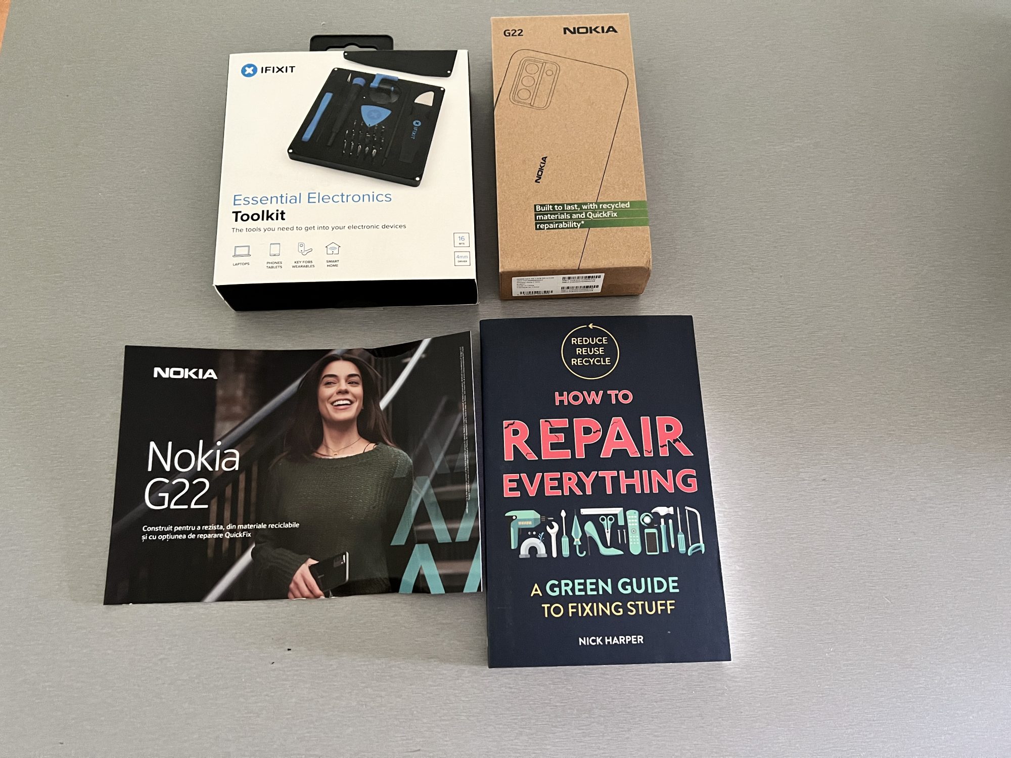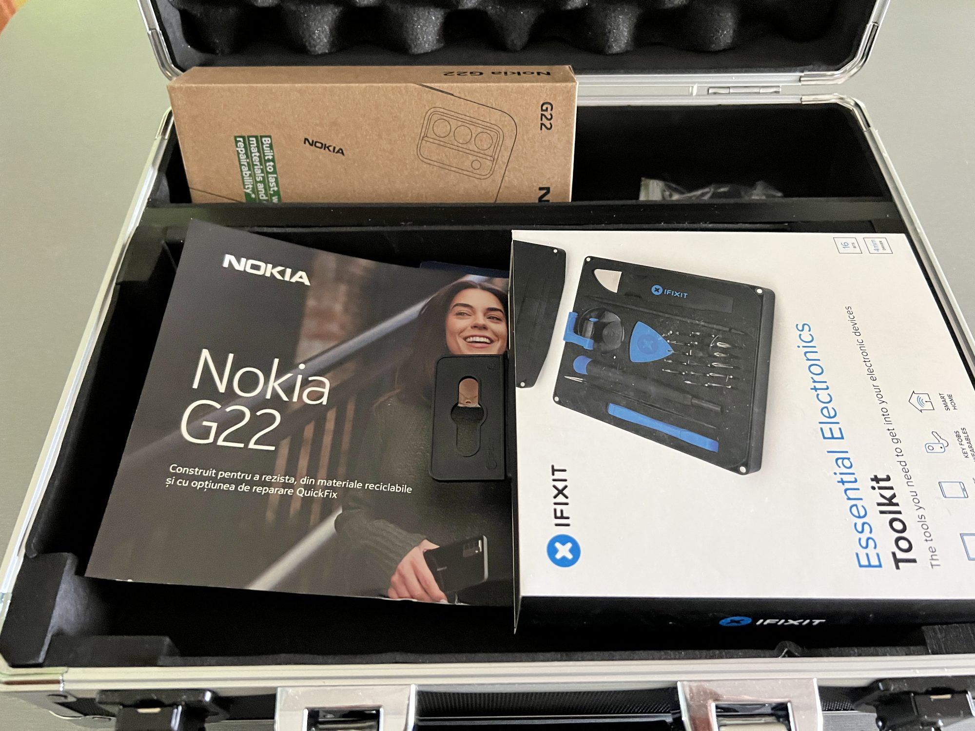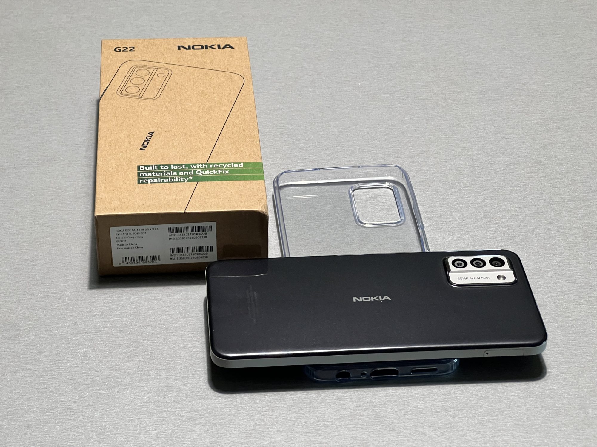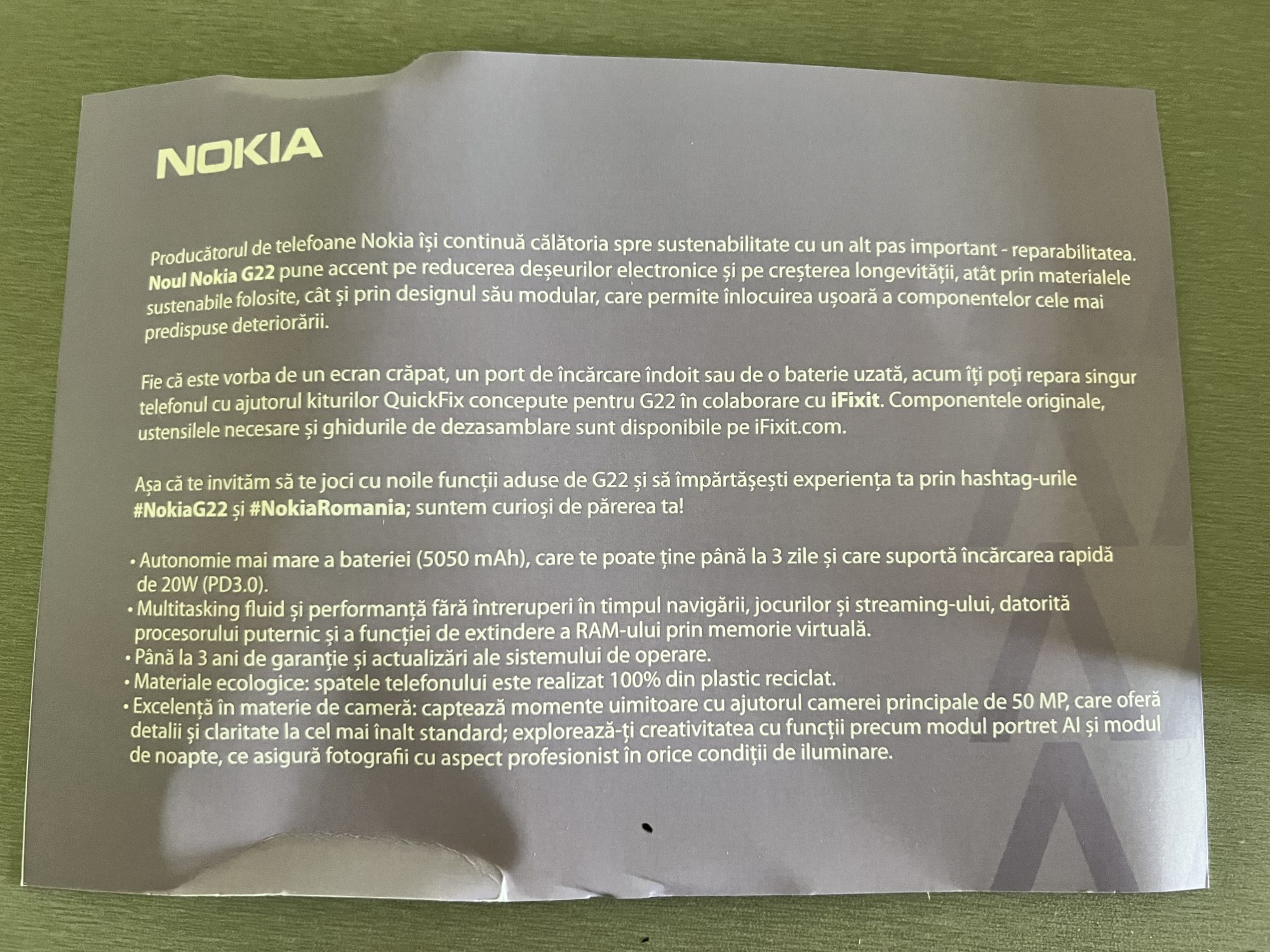 Dacă vă întrebați de ce tot coletul – ei bine Nokia G22 (da, are logo vechi, dar asta e!) este un smartphone creat din materiale reciclate (chiar și cutia de carton în care vine e din material reciclat) și se poate repara acasă, conform noului standard QuickFix.