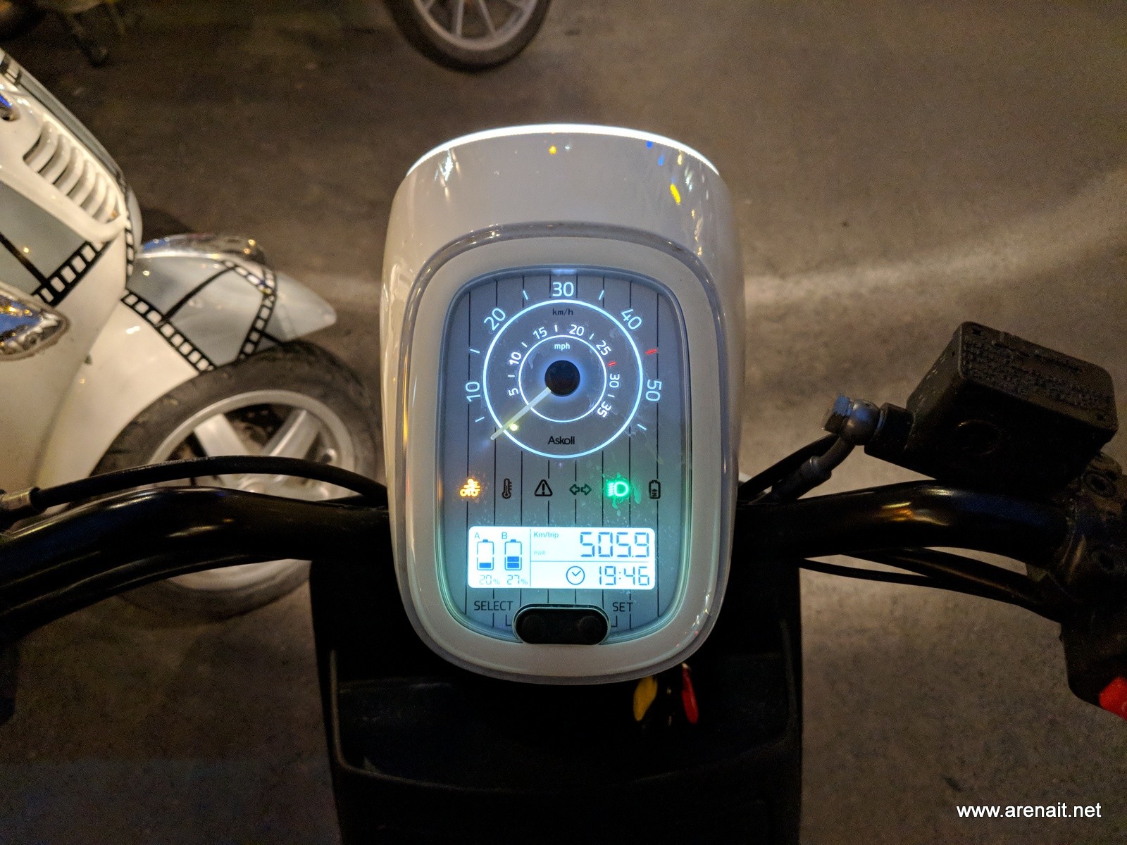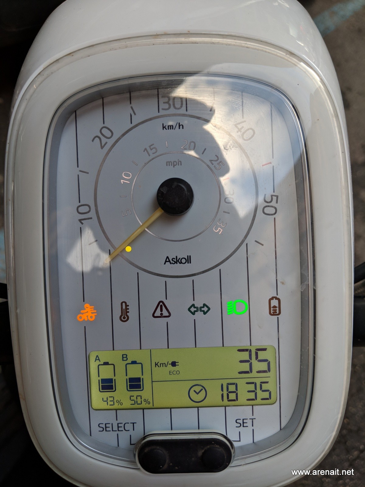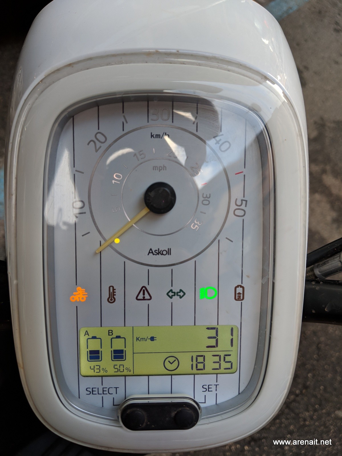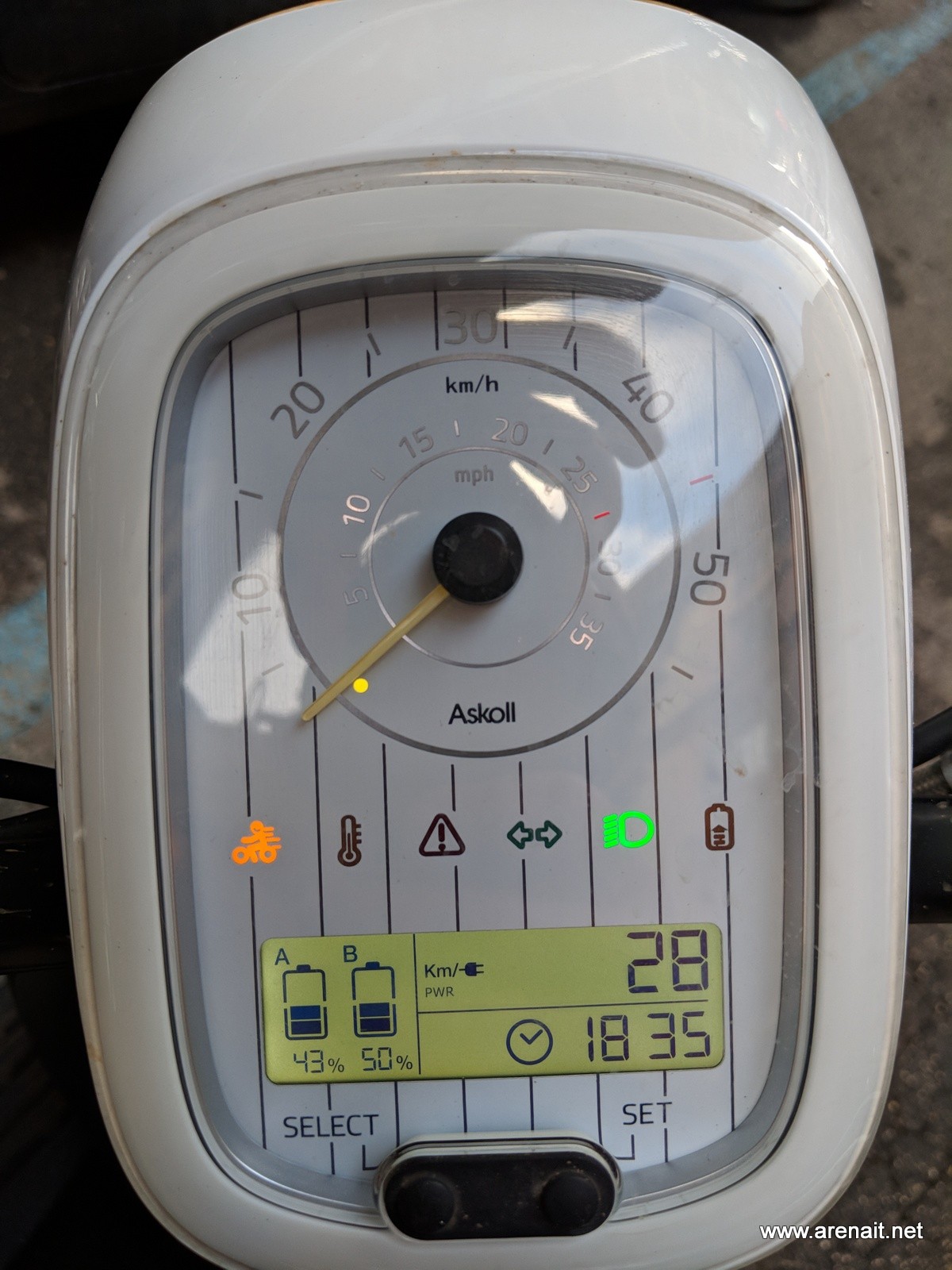 Scuterul are si un mic display pe care vezi capacitatea ramasa a bateriei (in stanga) si un mic trip computer in dreapta. Pe acesta din urma poti sa consulti urmatoarele: total km parcursi, km parcursi de la reset, autonomie baterie in km.