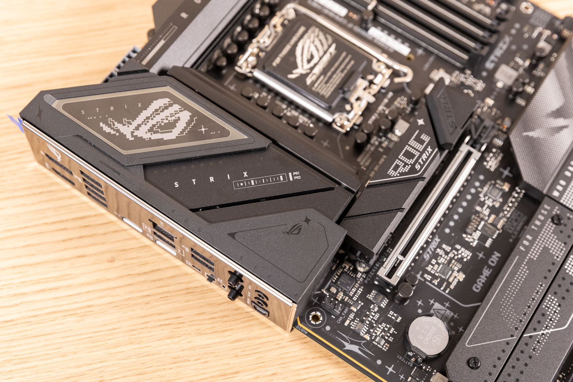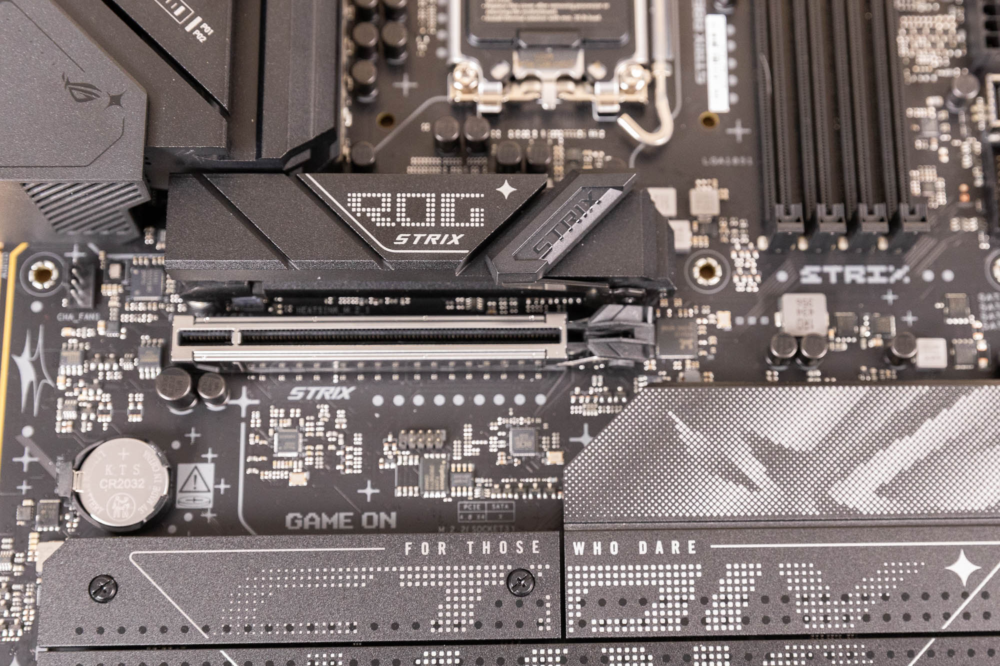 În plus, sunt disponibile trei sloturi PCIe 4.0 M.2 suplimentare, oferind spațiu pentru o configurație extinsă de SSD-uri. Acestea sunt acoperite cu plăci de disipare a căldurii. Vizual, acestea formează un logo STRIX.