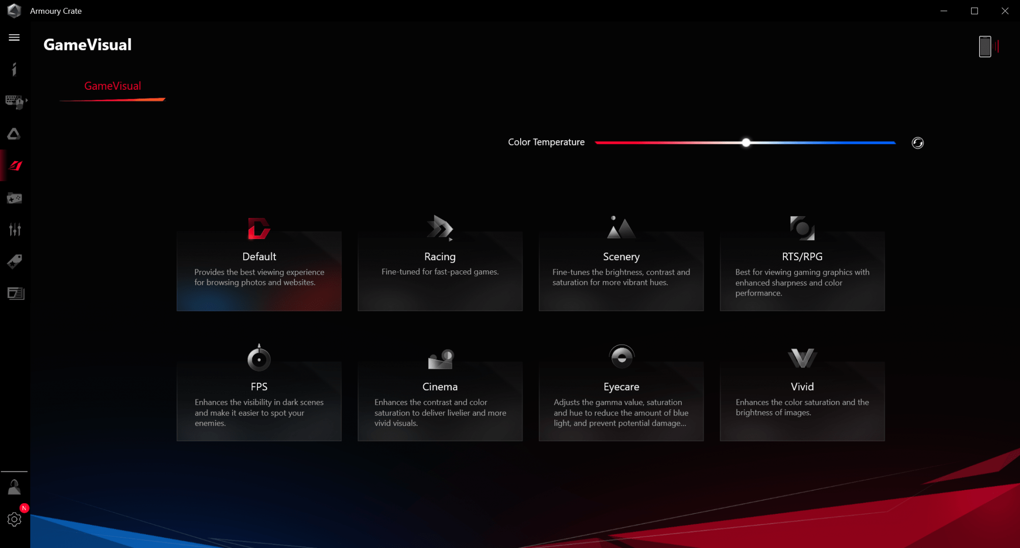 - Armoury Crate – este poate cel mai bine pus la punct Control Center de pe un laptop. De aici poti seta orice iti trece tie prin cap. Are inclusiv moduri de imagine in functie de activitatea pe care o desfasori, poti dezactiva placa video, poti face OC la procesor si multe altele. Am atasat doar 4 capturi cu ce mi s-a parut mie mai interesant acolo.