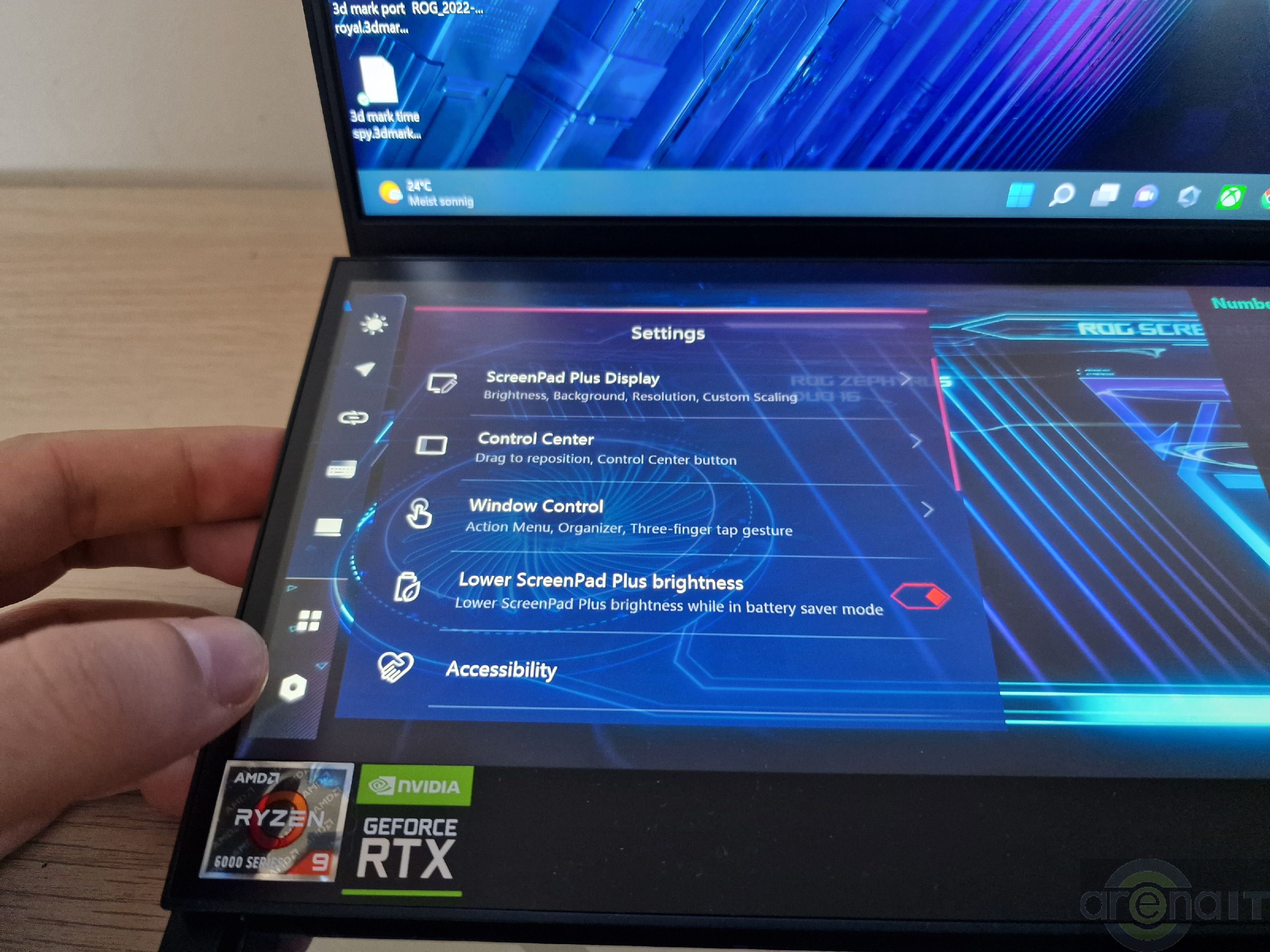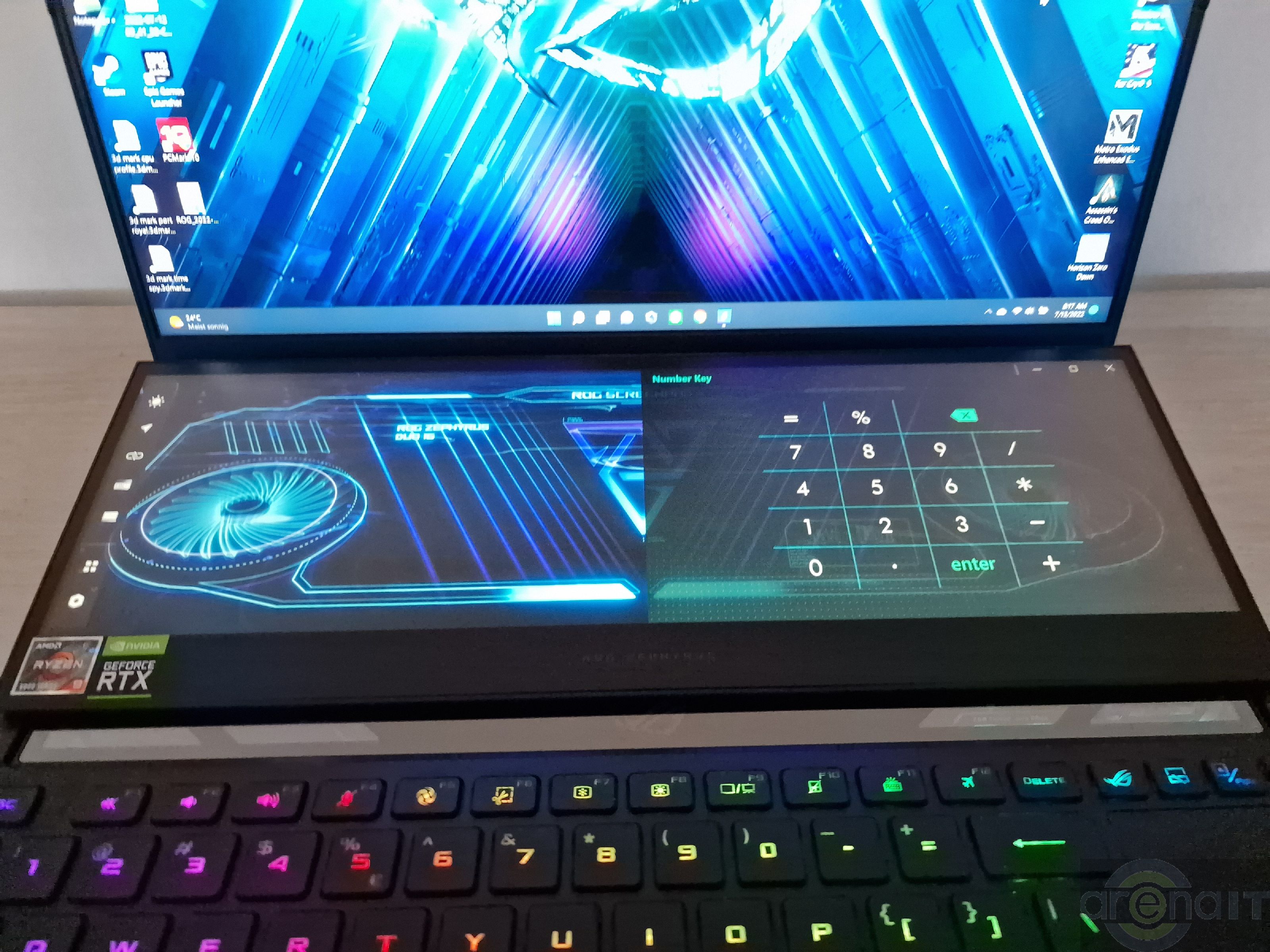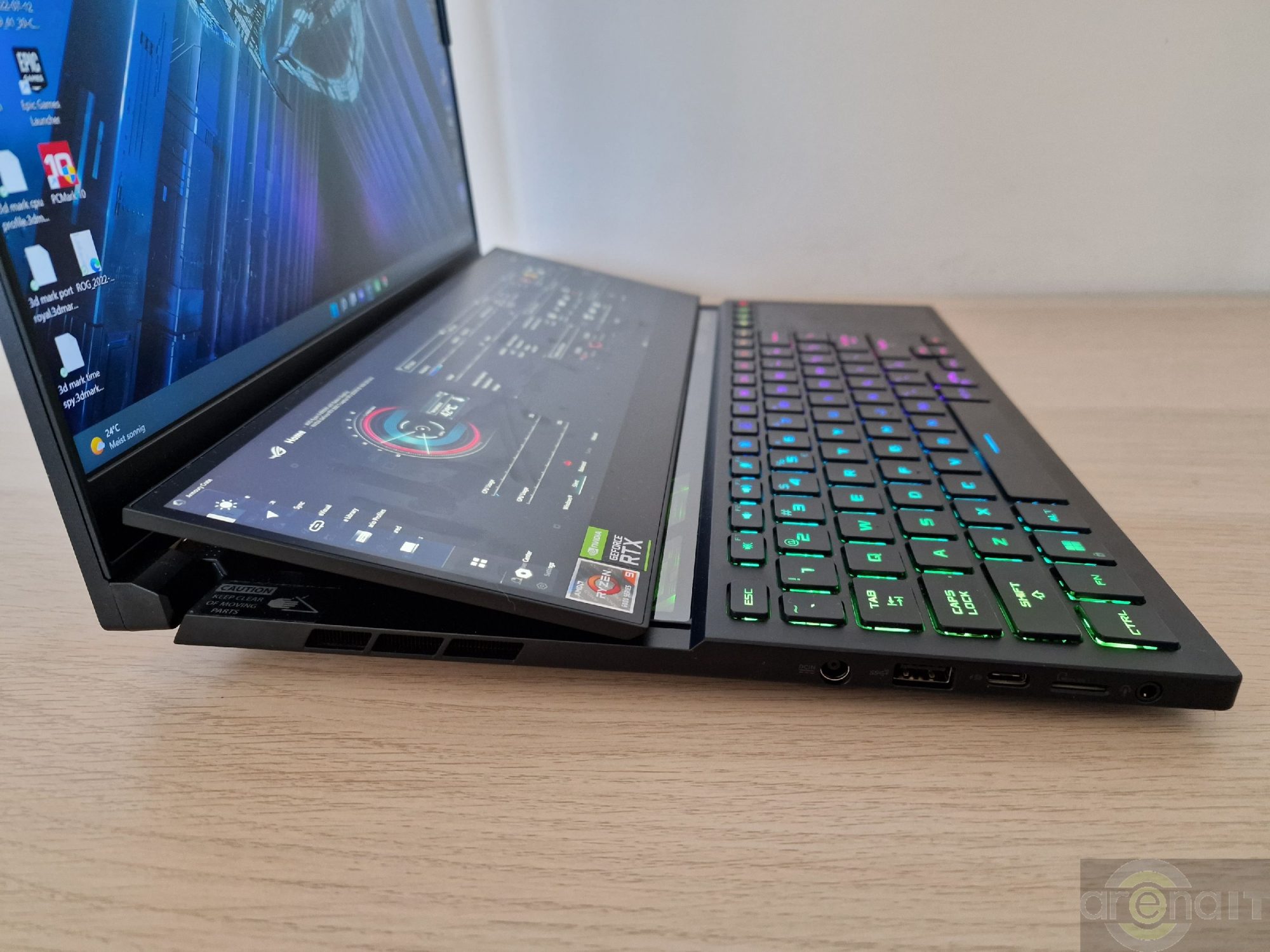 Prin intermediul aplicatiei MyAsus, continutul de pe telefonul mobil poate fi streamuit pe acest ecran si se poate controla telefonul, inclusiv pentru apeluri. In timpul petrecut de mine cu el, am pastrat pe acest ecran aplicatia ROG Armoury Crate cu dashboard-ul aferent temperaturilor si gradului de utilizare al componentelor laptopului. Puteti tine browserul, documentatie, cod daca scrieti linii de cod si este orientat spre productivitate si streaming.