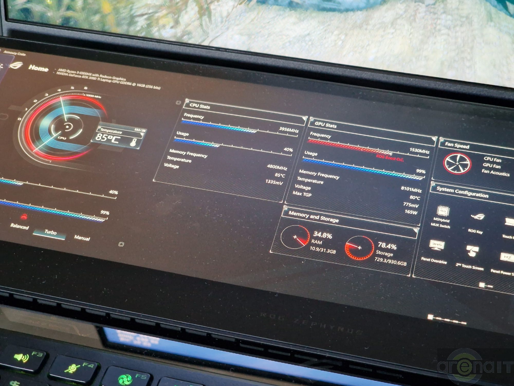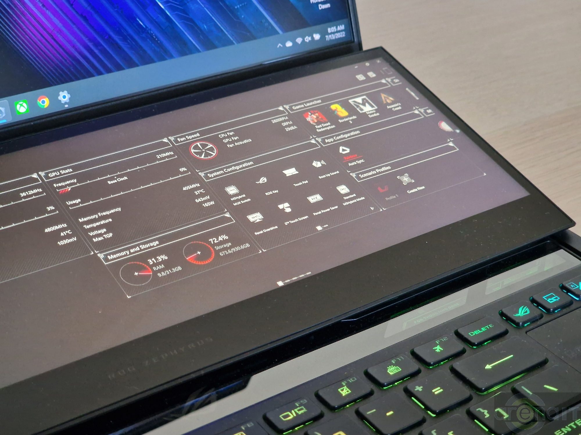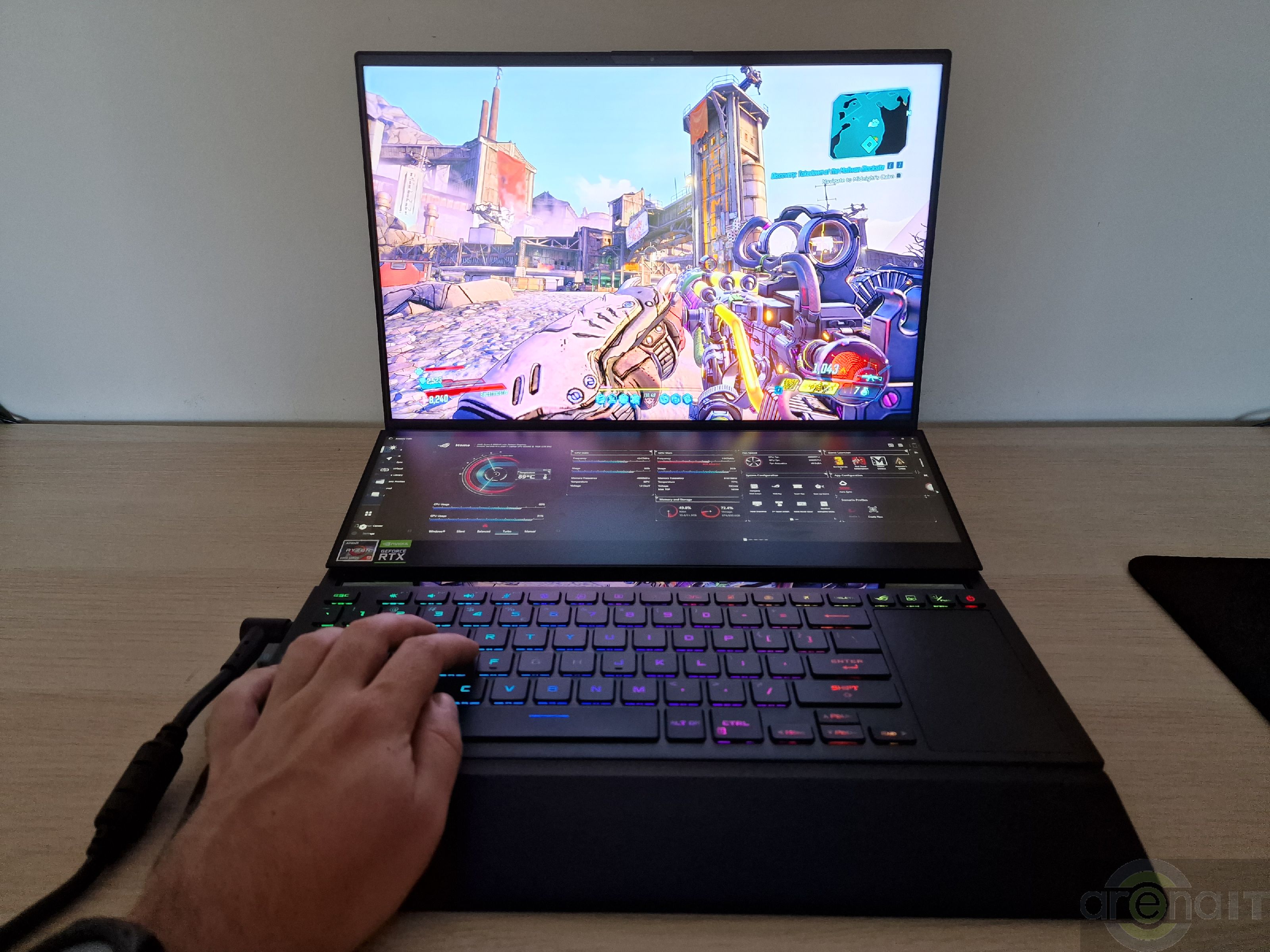 Prin intermediul aplicatiei MyAsus, continutul de pe telefonul mobil poate fi streamuit pe acest ecran si se poate controla telefonul, inclusiv pentru apeluri. In timpul petrecut de mine cu el, am pastrat pe acest ecran aplicatia ROG Armoury Crate cu dashboard-ul aferent temperaturilor si gradului de utilizare al componentelor laptopului. Puteti tine browserul, documentatie, cod daca scrieti linii de cod si este orientat spre productivitate si streaming.