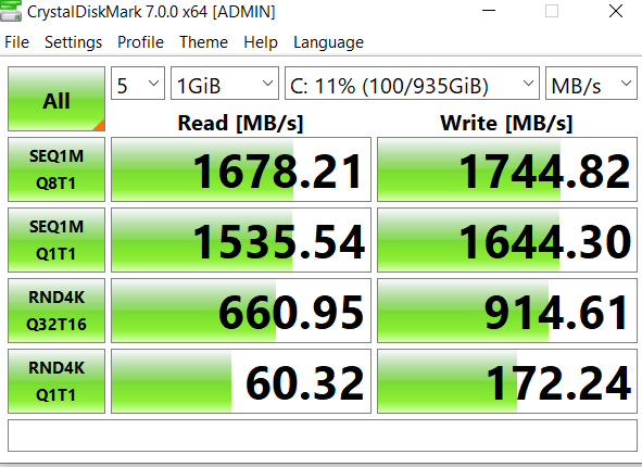 – Stocarea: au pus un Intel 660p, deci un QLC ieftin. Pe la 50% umplere ajunge la 100MB/s. Si la capacitatea de 1TB are doar 200TB TBW. Mai au un slot PCIe x2 liber.