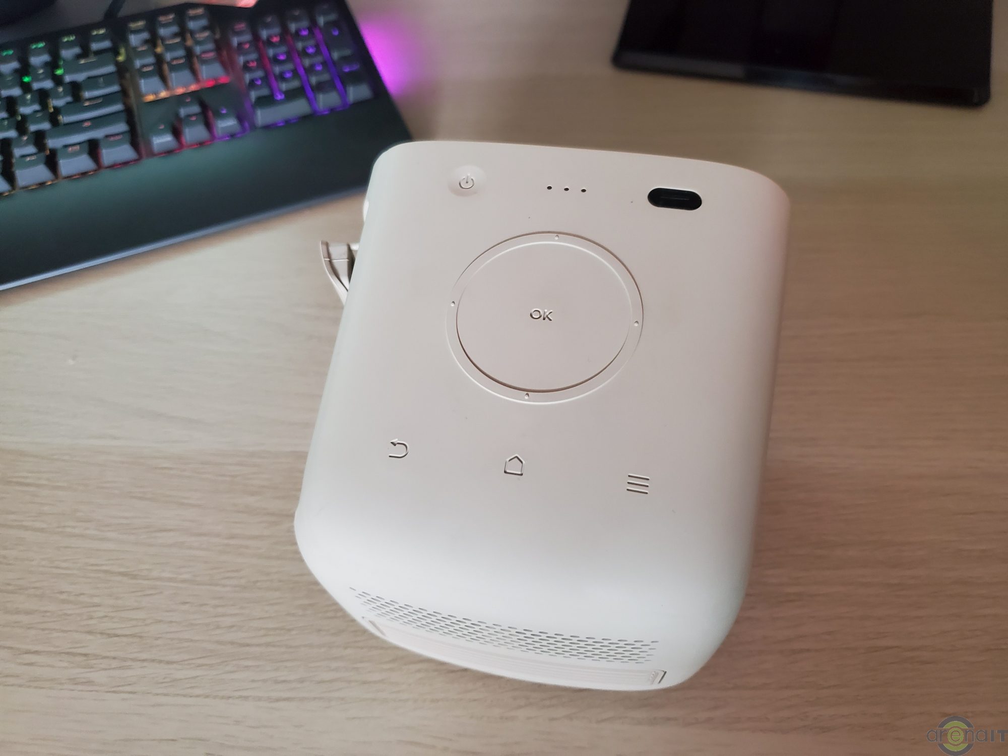 Sunetul este asigurat de 2 difuzoare de 2w si bineinteles ca il puteti folosi si drept boxa. Muzica poate fi redata prin bluetooth de pe telefon sau direct de pe YouTube sau alte aplicatii daca aveti o conexiune de internet catre proiector. Puterea si calitatea este decenta, dar nimic impresionant aici.
