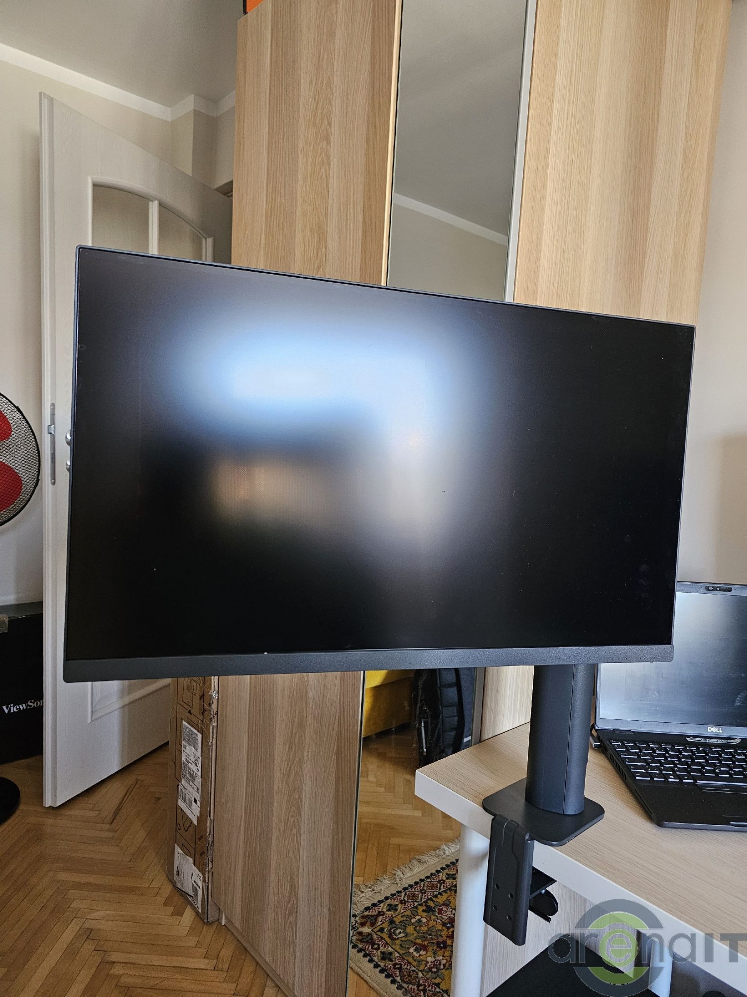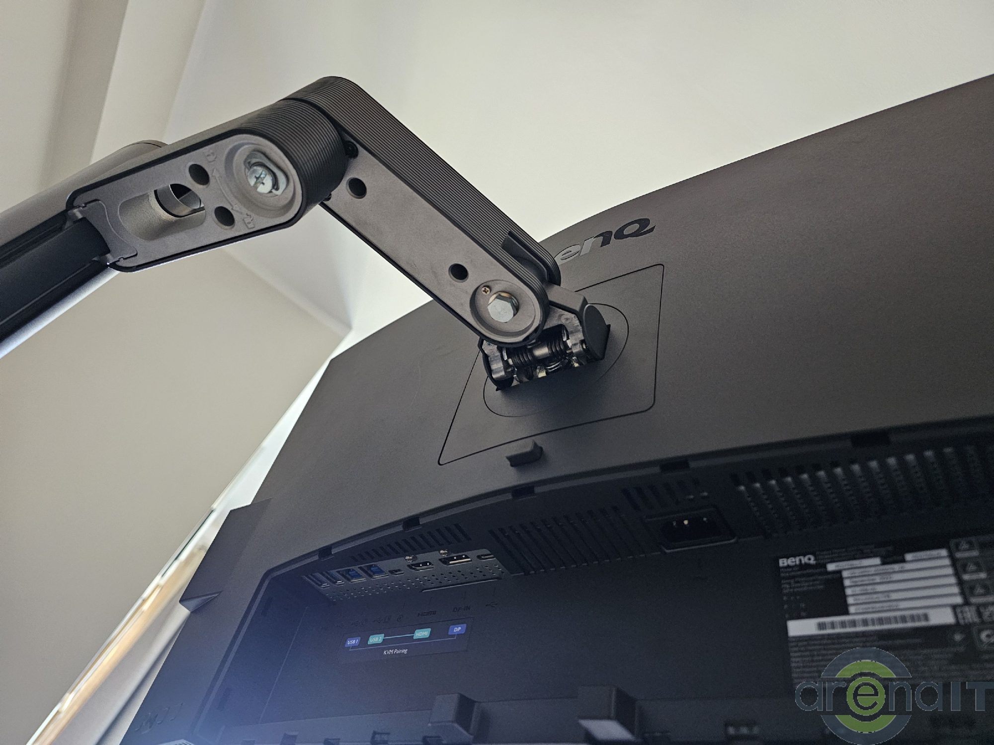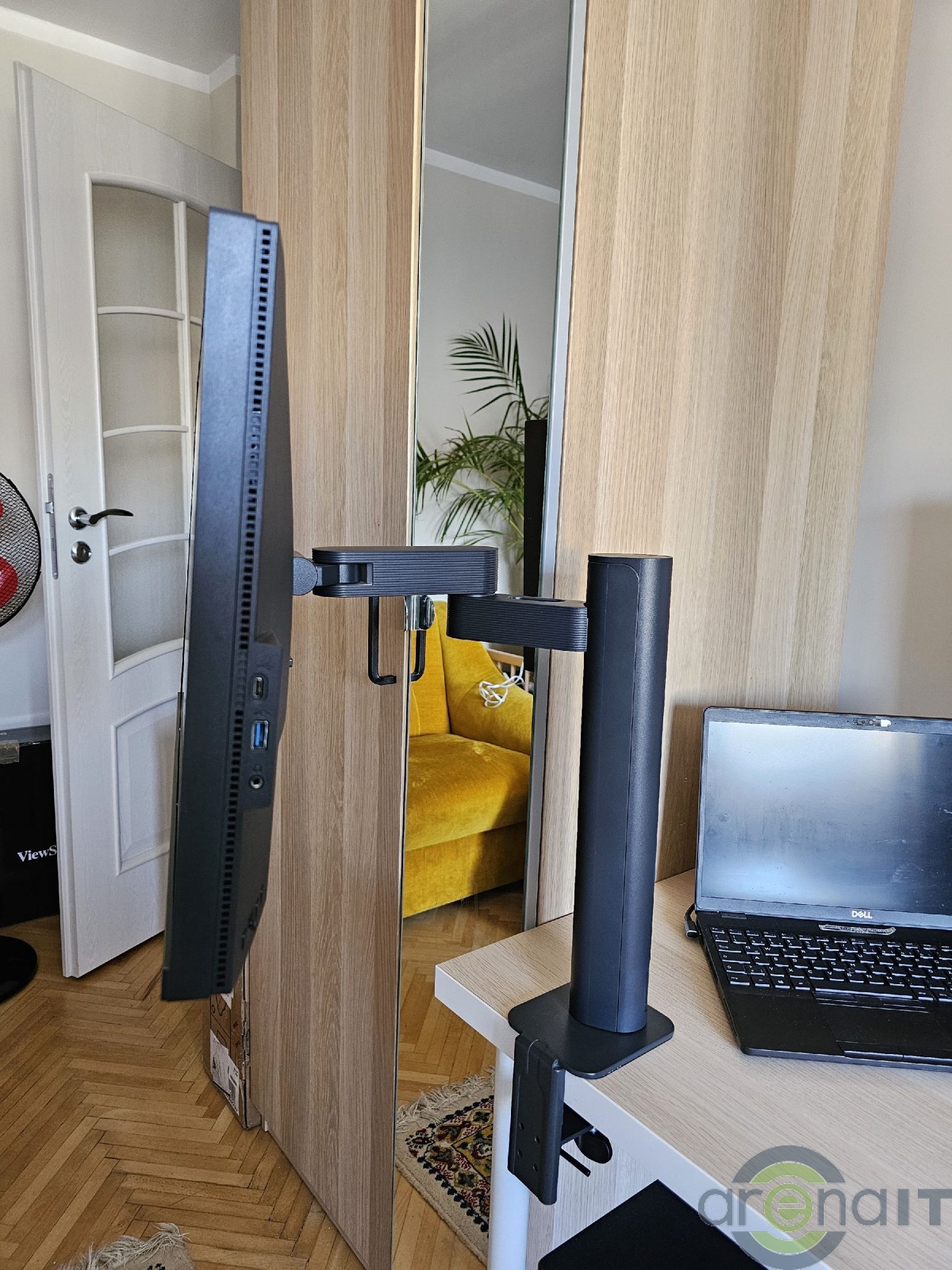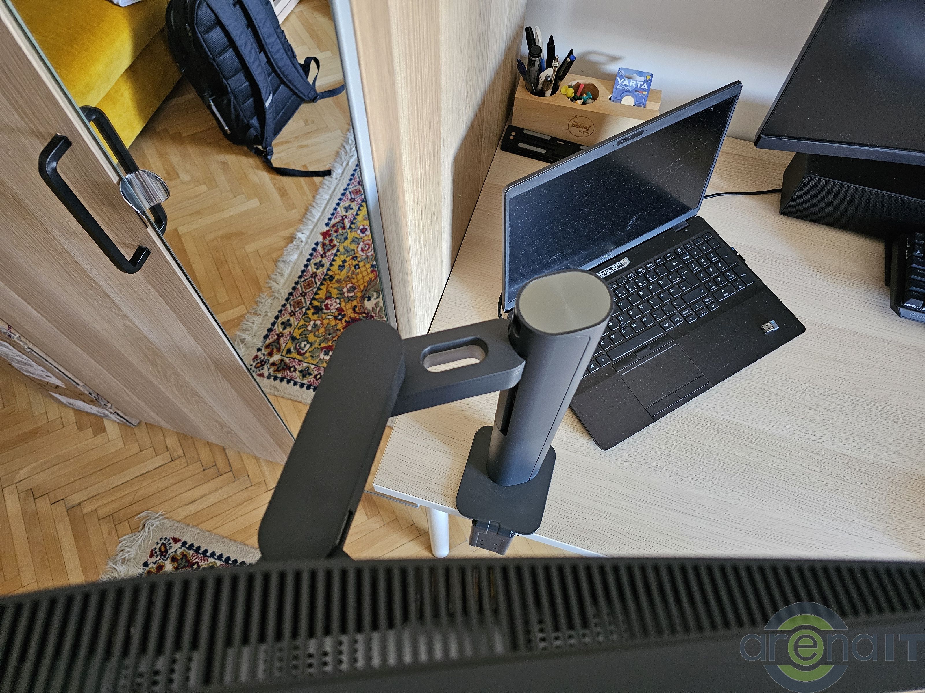 In primul rand acesta se face remarcat prin bratul ergonomic si personalizabil fara limite. Ofera posibilitati multiple de a fi utilizat si se poate regla pe toate unghiurile, inclinatiile sau inaltimea dorita. Singurul aspect care il poate limita este lungimea cablului de alimentare sau pozitionarea prizei, dar si asta se poate rezolva usor cu un prelungitor. Revenind la brat, acesta se fixeaza precis pe birou, ofera o stabilitate perfecta si ocupa un loc minim. In cel mai productiv scenariu, eu l-as vedea montat pe un birou central, unde cu usurinta poate fi conectat la acesta prin intermediul portului USB tip C cu power delivery un laptop sau un telefon Samsung cu DeX.