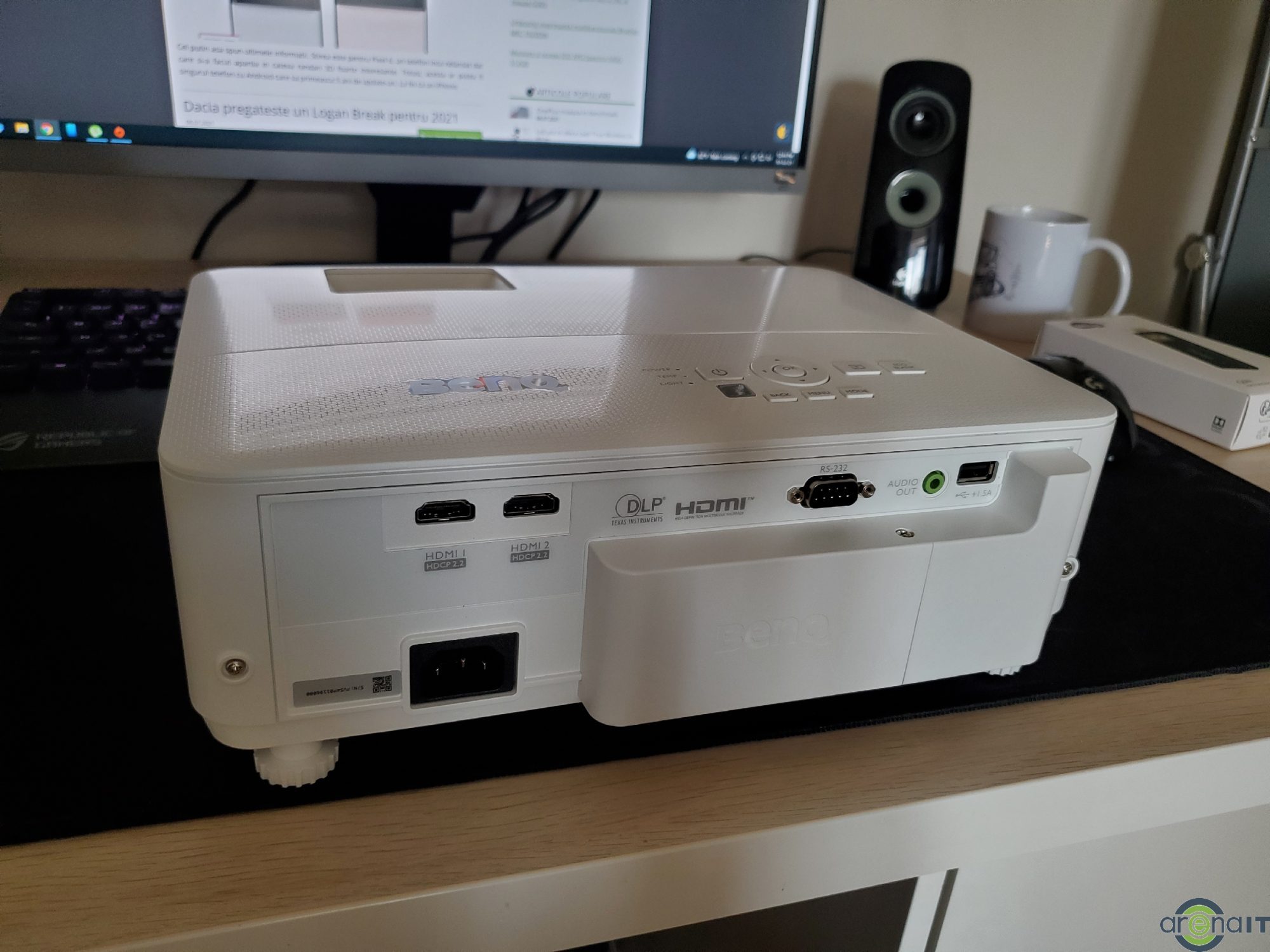 Revenind la piesa de rezistenta, W1800i este echipat cu 2 porturi HDMI, HDCP 2.2, un port USB tip A, un jack de 3.5mm pentru iesire audio si un port RS232. Portul HDMI pentru dongle este separat, ascuns sub un plastic, unde este prezent si cablul microUSB pentru alimentarea acestuia.