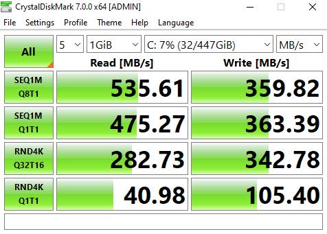 Și iată că am ajuns și la stocare. Cum vă spuneam, este un SSD modest. Avem un Apacer AS350 de 480GB. Este prima data când folosesc un SSD de la acest producător și sunt convins că puteau să pună un model mai bun, dar atunci și prețul sistemului ar fi crescut. Chiar dacă SSD-ul este unul de buget, cu un brand care nu poate oferi neapărat încredere, vitezele sunt bune.