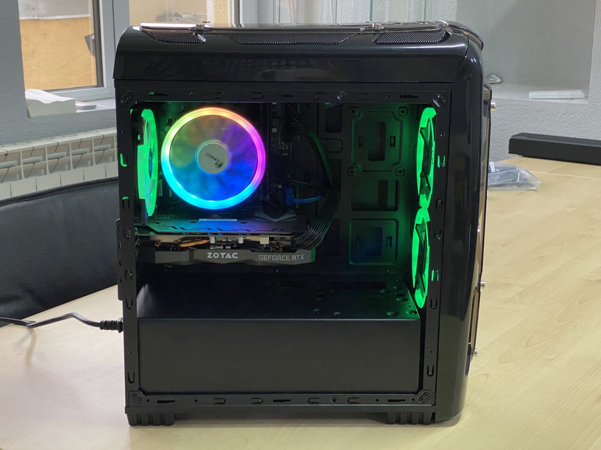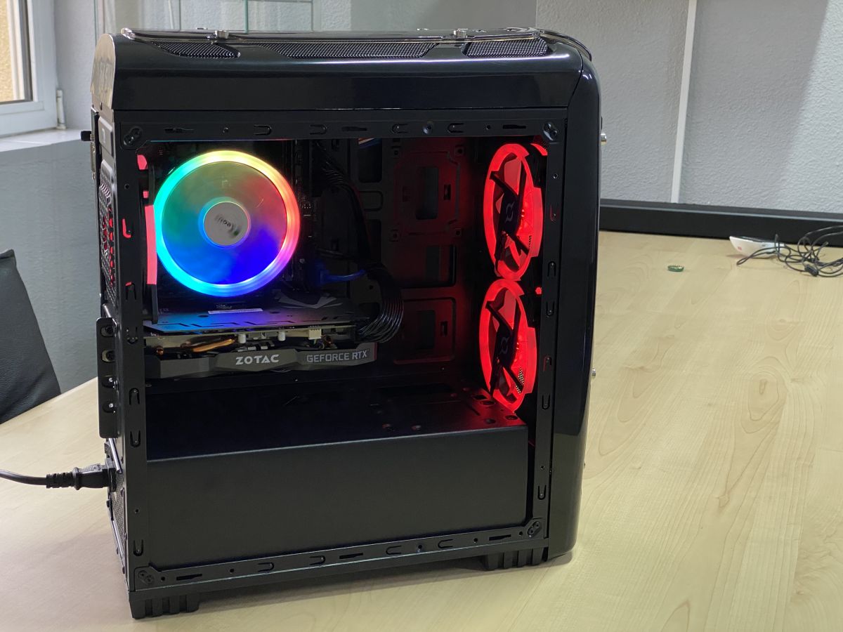 Carcasa este mica și plina de luminițe RGB. Au optat pentru o soluție ieftina pentru a putea ține jos prețul sistemului. În schimb, avem o sursă bună și un cooler aftermarket care își face treaba excelent.