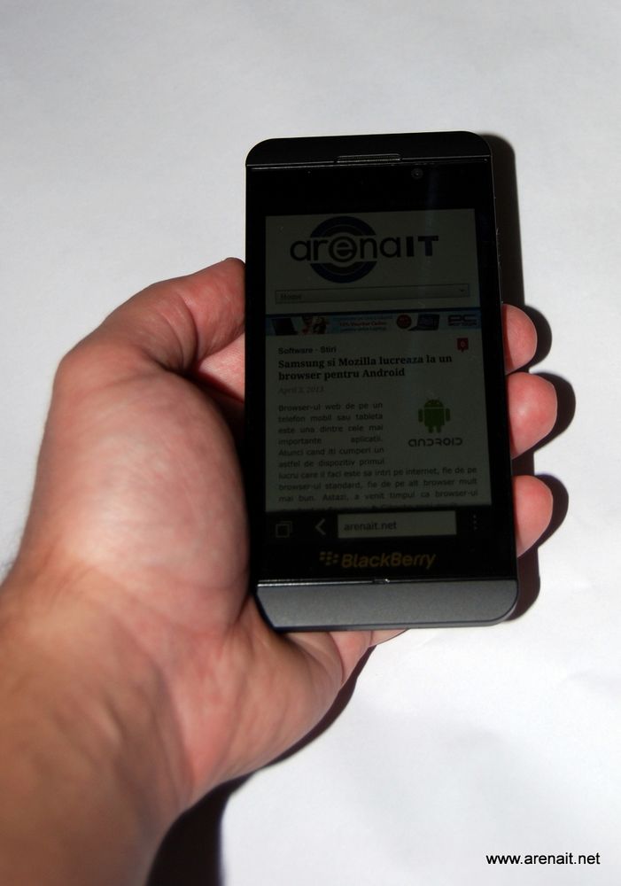 Unii spun ca nu are contrast foarte bun si ca intensitatea culorilor nu este cea mai fericita. Adevarul e undeva la mijloc, cert este ca pe BlackBerry Z10 se poate citi foarte bine si informatia e clara. Imaginea e foarte buna si precisa, cum te-ai astepta de la un ecran de 4.2 inch cu rezolutie 768 x 1280 pixels si densitatea pixelilor de 355 ppi.