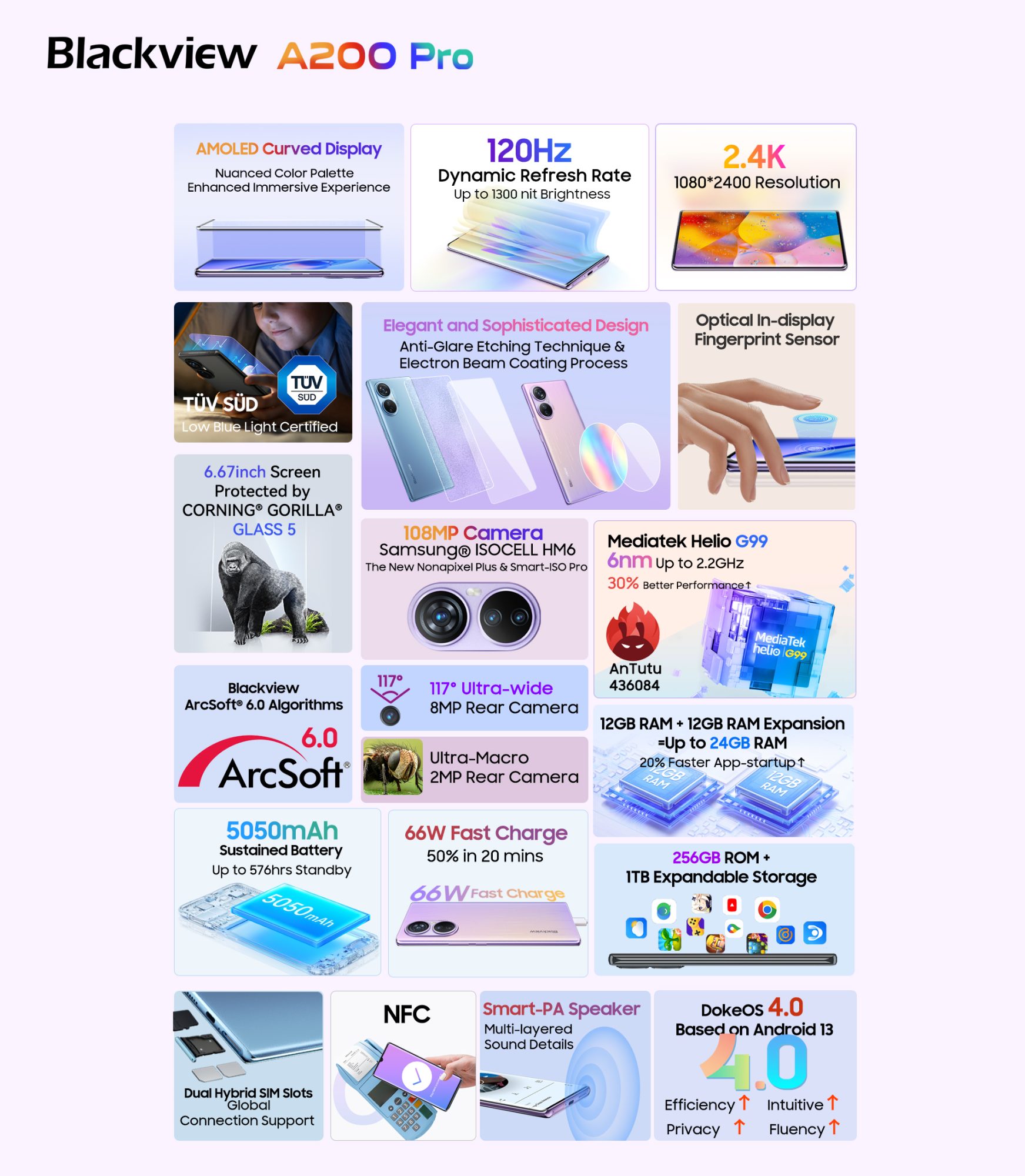 Inca de la primele informatii observam un smartphone cu design modern insa foarte familiar. A200 Pro dispune de un ecran AMOLED la 120Hz cu margini usor curbate, iar rezolutia este de 1080 x 2400 pixeli.