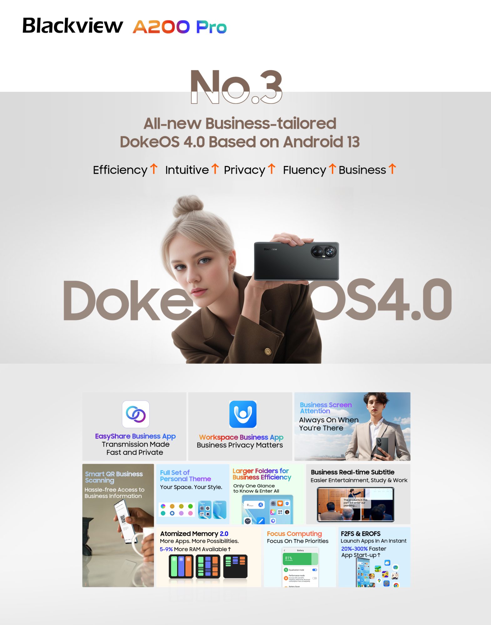 Ruleaza o interfata proprietara DokeOS bazata pe Android 13, simpla si intuitiva. Legat de memorie, discutam despre cipuri UFS 2.2 RAM si LPDDR4X, iar memoria RAM poate ajunge pana la 24GB (12GB RAM in standard cred si inca 12GB RAM contra cost).