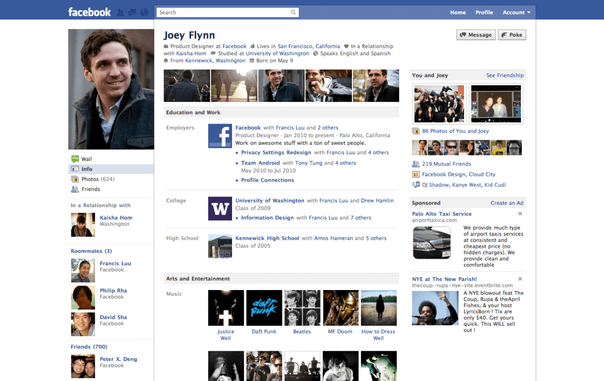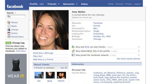 De-a lungul timpului, aspectul celor de la Facebook a fost destul de controversat, au pornit de la ceva simplu, asemanator Hi5, au continuat cu putin din Twitter si acum si-au personalizat cat de cat designul paginilor. Cam asa arata in vechime Facebook-ul: