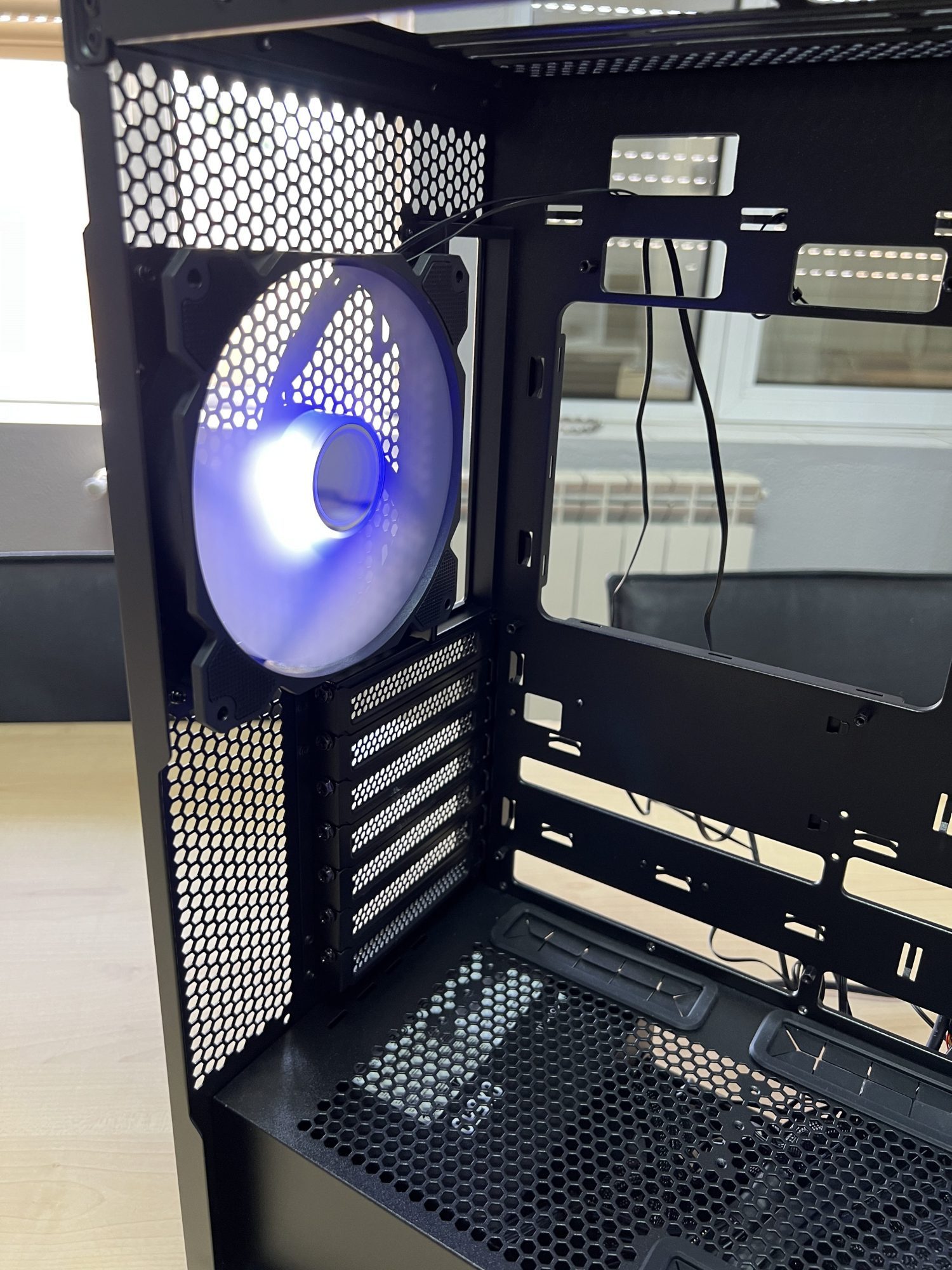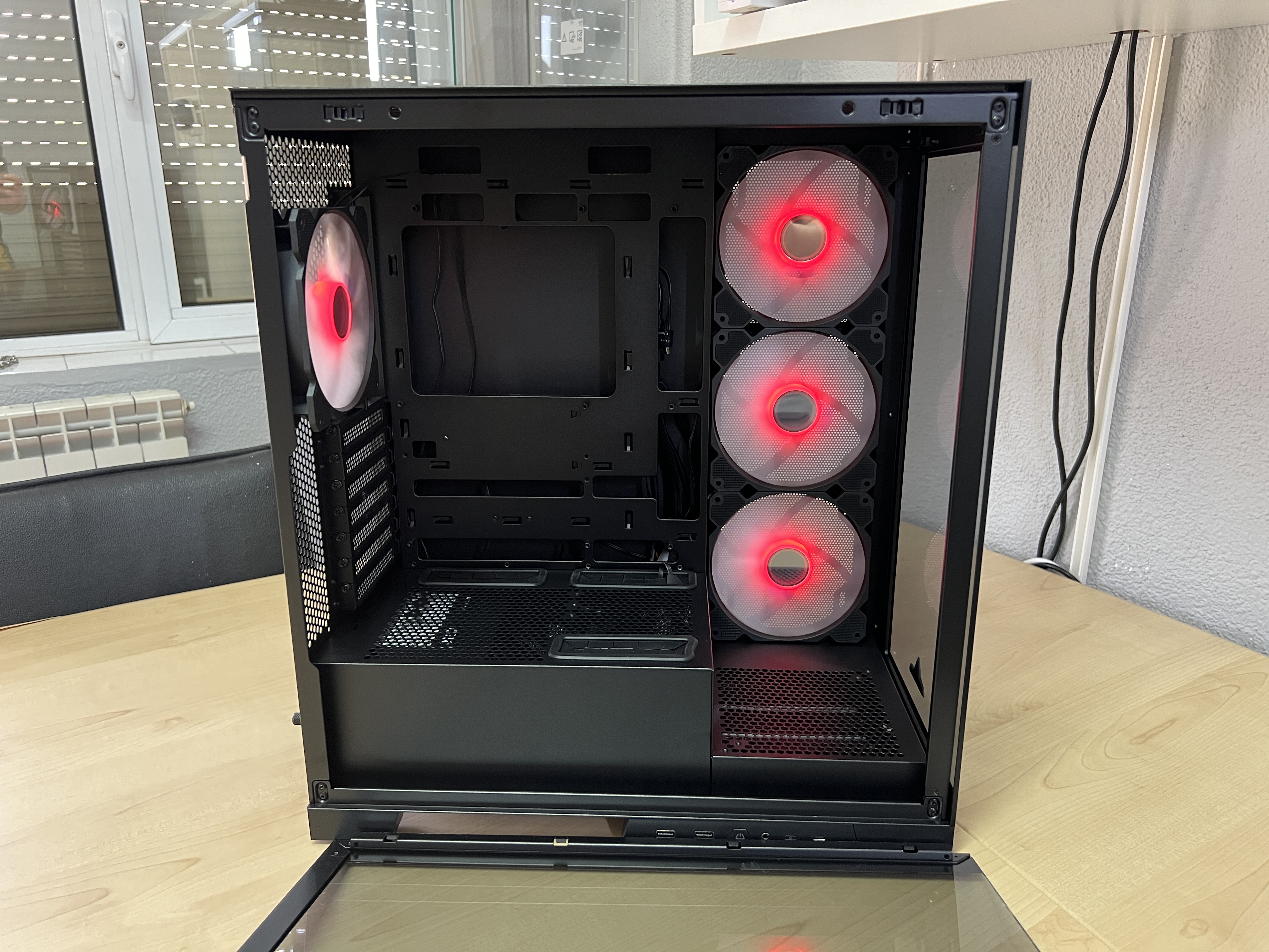 Carcasa cantareste 9.5kg, in special ca are panourile din sticla. Parerea mea este ca are o tabla decenta ca grosime si ca nu te tai in ea cand asamblezi. Poate una dintre cele mai cool chestii la carcasa este ca poti instala placa video in picioare si astfel de schimba radical sistemul.