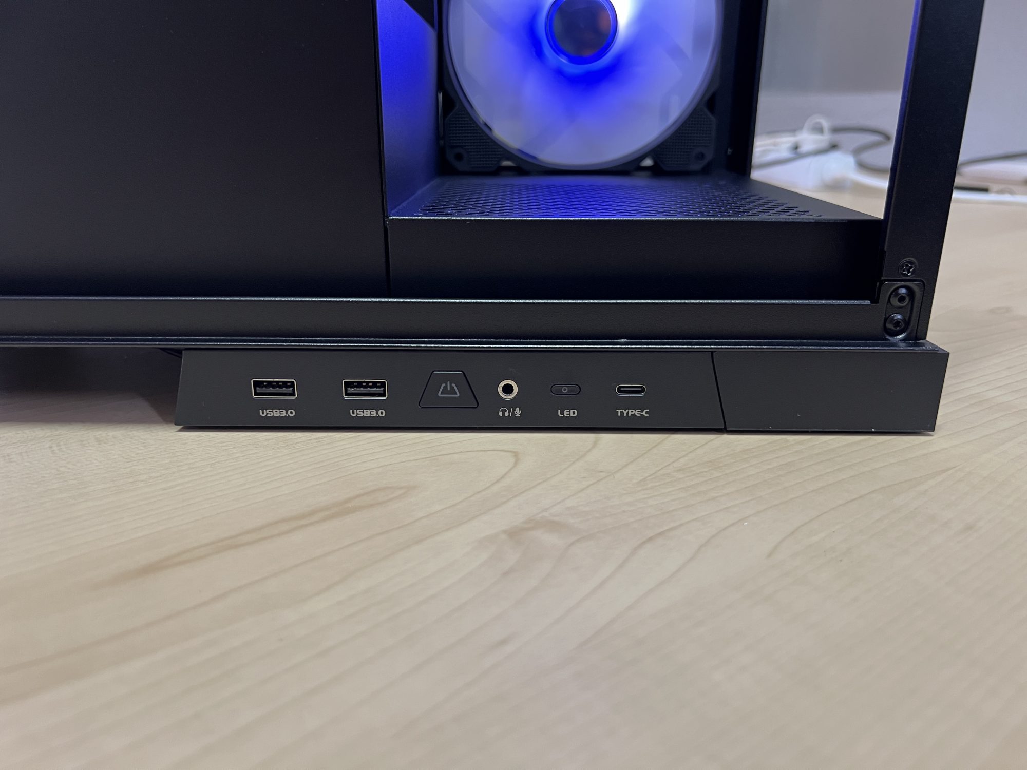 Carcasa este facuta sa stea pe birou, sa fie privita. De aceea o sa vedeti ca si butoanele si porturile sunt amplasate la baza carcasei, tu cand stai la birou sa ai acces usor la ele si sa le vezi. Ai USB 3.0, USB Type C, jack pentru casti si buton de power/reset. Cel de reset poate fi setat si sa schimbe iluminarea ventilatoarelor.