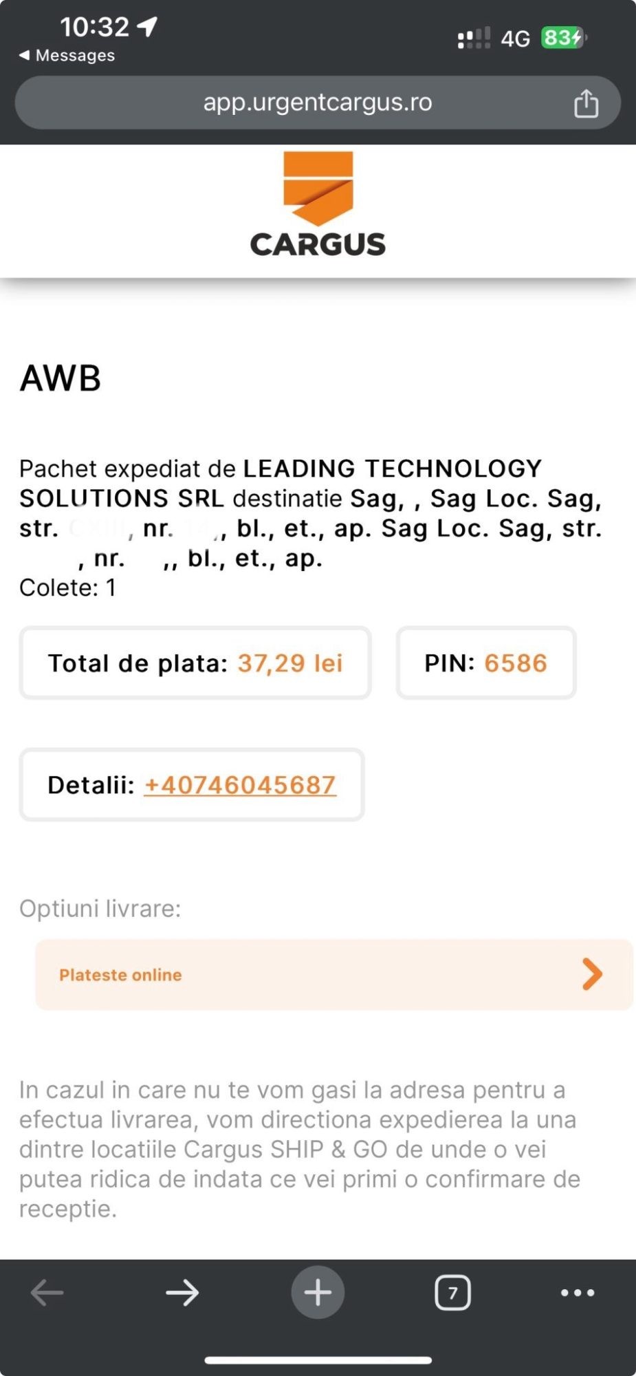 Long story short: dacă ai o comandă care este livrată cu Cargus, dar ai ales inițial plata ramburs, acum ai opțiunea de a efectua plata online. Practic, când primești SMS cu datele de livrare, ai și un link unde apar informațiile din poza de mai jos: