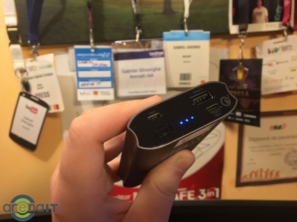 Bateria are 2 porturi importante: USB normal la care poti conecta orice cablu ai si un port USB C daca vrei sa conectezi telefonul direct prin acest standard. Insa pentru incarcarea ai vei apela la microUSB. Ai si un buton de Power care o porneste si iti indica nivelul de incarcare prin 4 LED-uri.