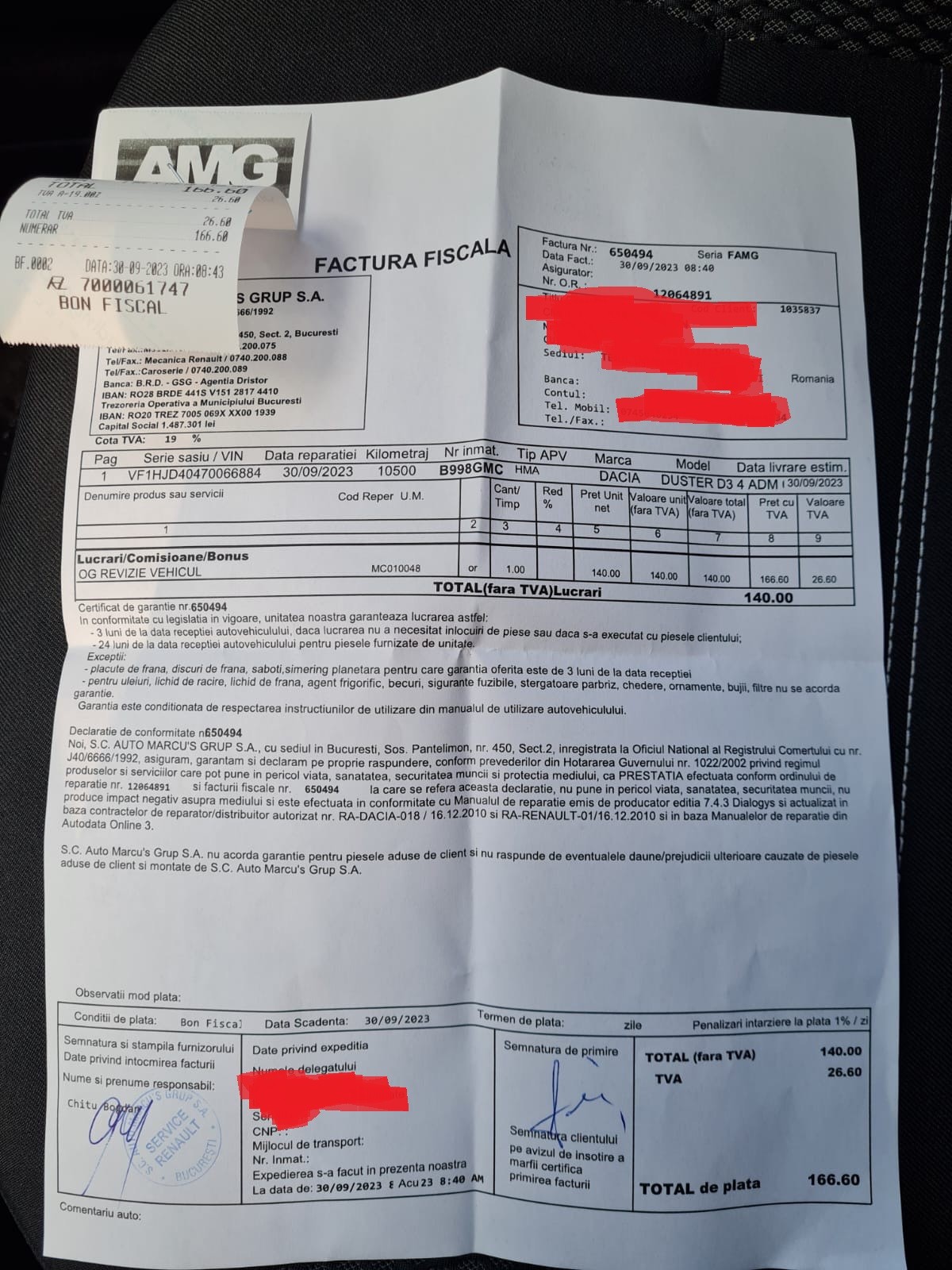 Aici am fost lasat cu piesele mele si uleiul meu si am platit doar manopera. Cat credeti ca a costat toata smecheria? Piesele au fost 600 lei, iar manopera 150 lei. Un total de 750 lei pentru o prima revizie nu este deloc mult in conditiile in care eu platesc la Megane-ul meu cam tot atat. Luati in considerare ca cea mai scumpa piesa a fost filtrul de motorina, 200 lei, care nu trebuie schimbat atat de des. Data viitoare nu o sa-l mai schimb, deci deja vorbim de 200 lei mai putin. La Megane il schimb o data pe an sau 30.000km si arata ca nou, deci poate fi schimbat si mai tarziu.