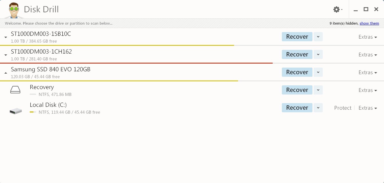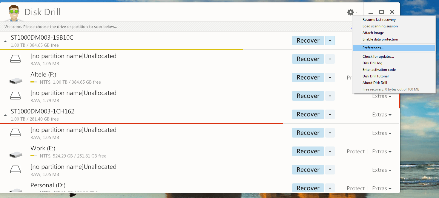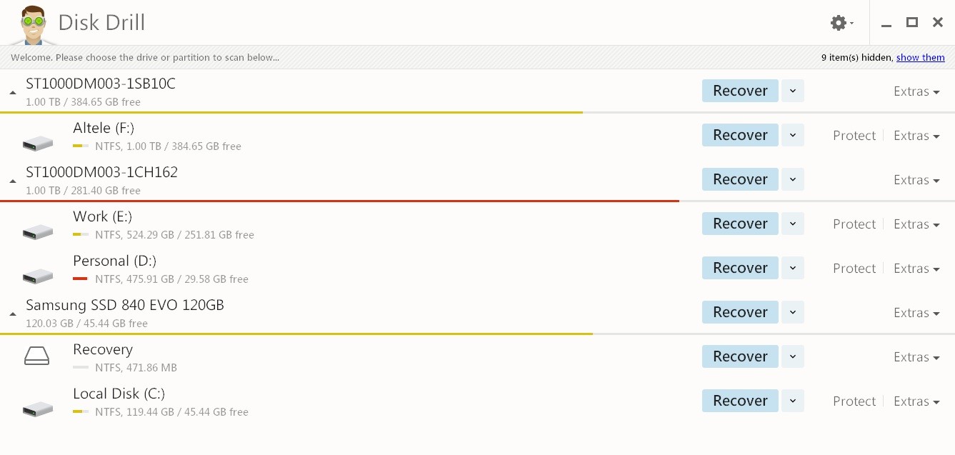 Din cate stiu, Disk Drill este un soft american. Nu prea ma intereseaza originile unui soft, insa cand e vorba de date sunt mai atent. Aplicatia este foarte simpla si cu o interfata minimalista. Aceasta iti va citi automat toate unitatile de stocare pe care le ai in PC. In cazul meu 2 HDD-uri (3 partitii in total) si un SSD. Imi place ca iti arata si denumirea componentei, fiind mai usor sa o recunosti uneori.