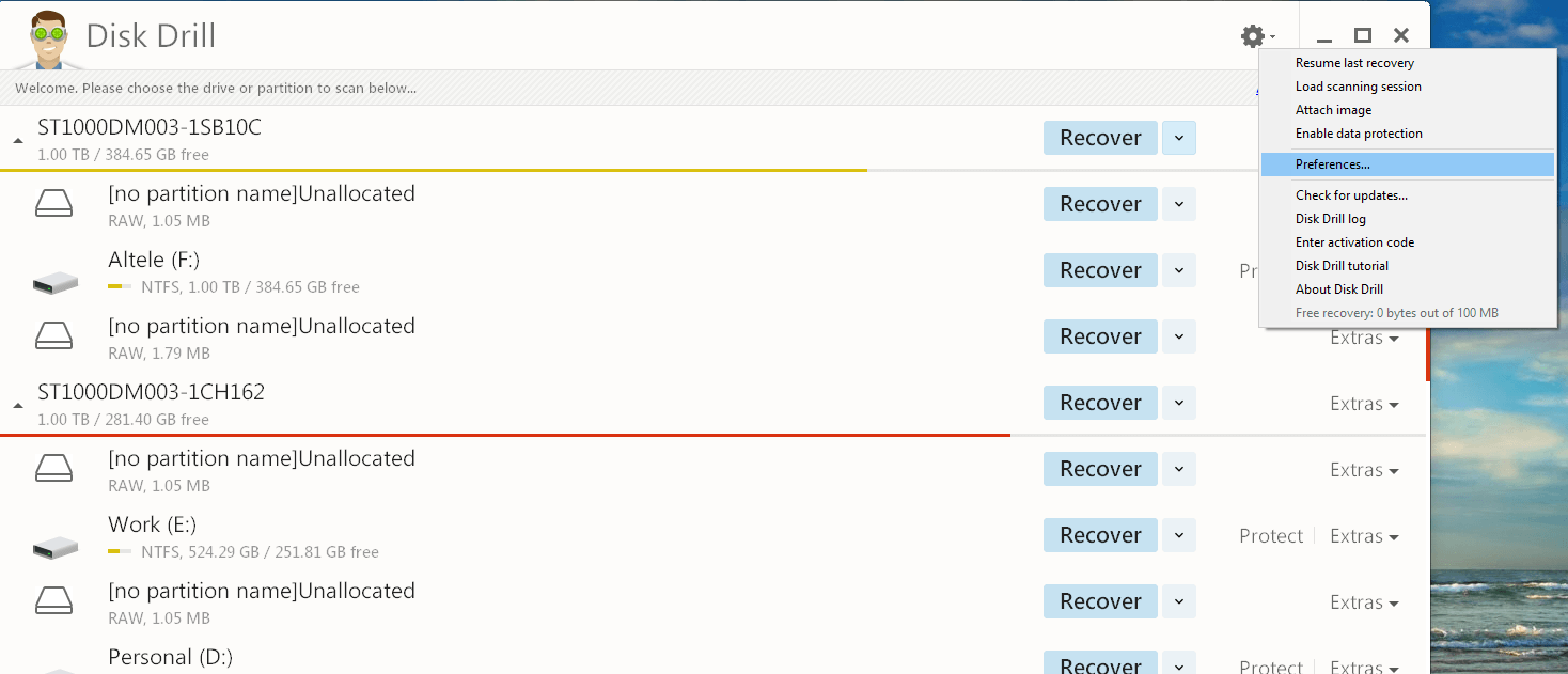 Partitia cu Windows (C) este prezentata separat, ca sa o ai in evidenta. In dreapta lor este prezentat un buton pe care scrie Recover, insa pana sa ajungem la el, este bine sa aruncam un ochi si prin setarile aplicatiei. Lucru pe care eu l-am facut tarziu, ca am fost chior la miez de noapte si nu am vazut butonul.