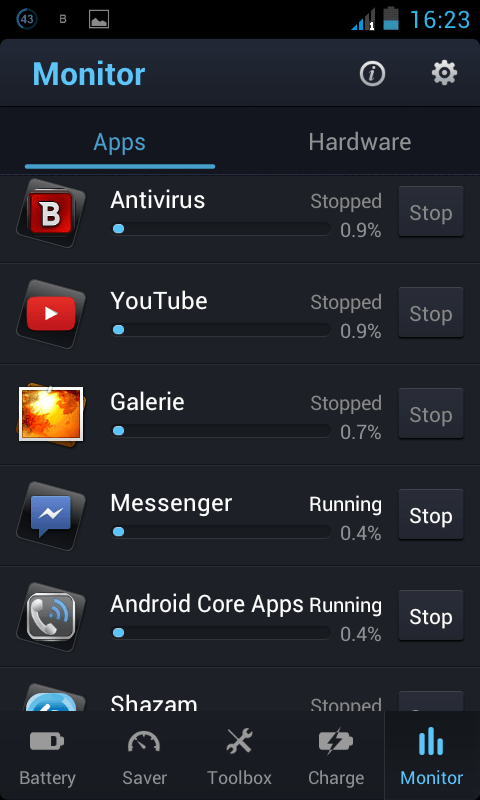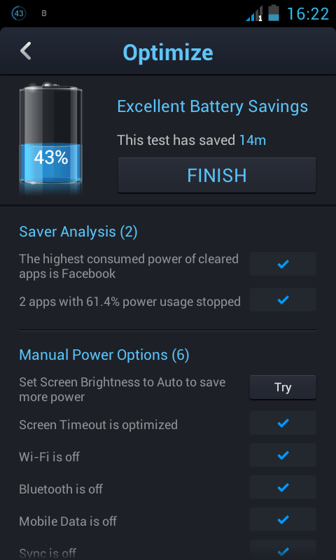 La inceput am crezut ca e inca o porcarie care nu face altceva decat sa-ti ocupe din memorie, dar dupa ce m-am jucat un pic prin el, mi-am dat seama ca de asa ceva am nevoie. Am gasit aplicatia care ma putea ajuta cu problema pe care o intampinam. Cred ca pe departe cea mai importanta si cea mai recomandata este functia de optimizare pe care o pune la dispozitie. Aceasta functie opreste aplicatiile care ruleaza in background si calculeaza timpul cumulat pe care l-a salvat.
