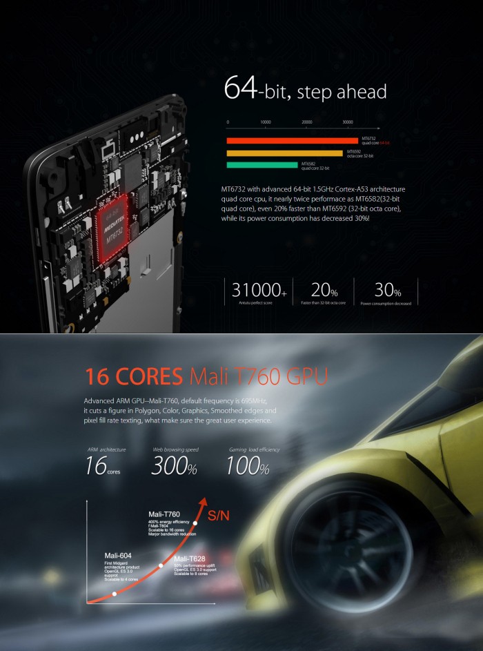 Avem de a face cu platforma MTK6732 cu 4 nuclee Cortex A53 la 1.5 GHz si 64 bit. GPU-ul este un Mali T760 cu 16 nuclee, memoria interna are 16 GB iar memoria RAM are 2 GB. Ecranul, chiar daca are 5 inch, este punctul slab al acestui smartphone, pentru ca are doar rezolutie de 1280 x 720 pixeli. Nu e rau, dar se putea mai bine.