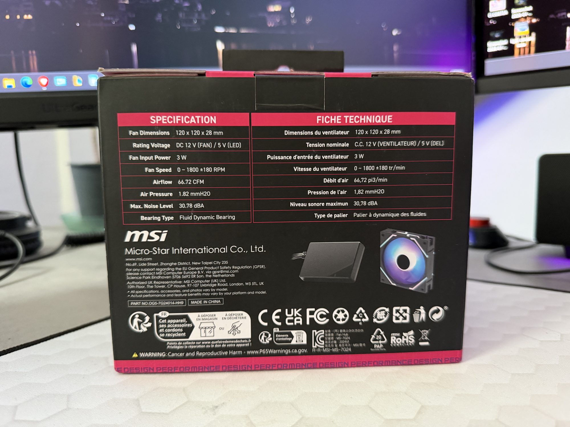 Din punct de vedere tehnic, ventilatoarele au dimensiuni 120 × 120 × 28 mm, deci sunt mai groase decât standardul de 25 mm. În general, asta ajută când vrei presiune mai bună prin filtre sau radiatoare, dar merită verificat spațiul din carcasă dacă ești la limită. MSI declară turație 0–1800 RPM, debit de aer 66,72 CFM, presiune statică 1,82 mmH2O și un nivel maxim de zgomot de 30,78 dBA. Pentru lagăr se folosește Fluid Dynamic Bearing, o alegere bună pentru fiabilitate și funcționare corectă în timp.