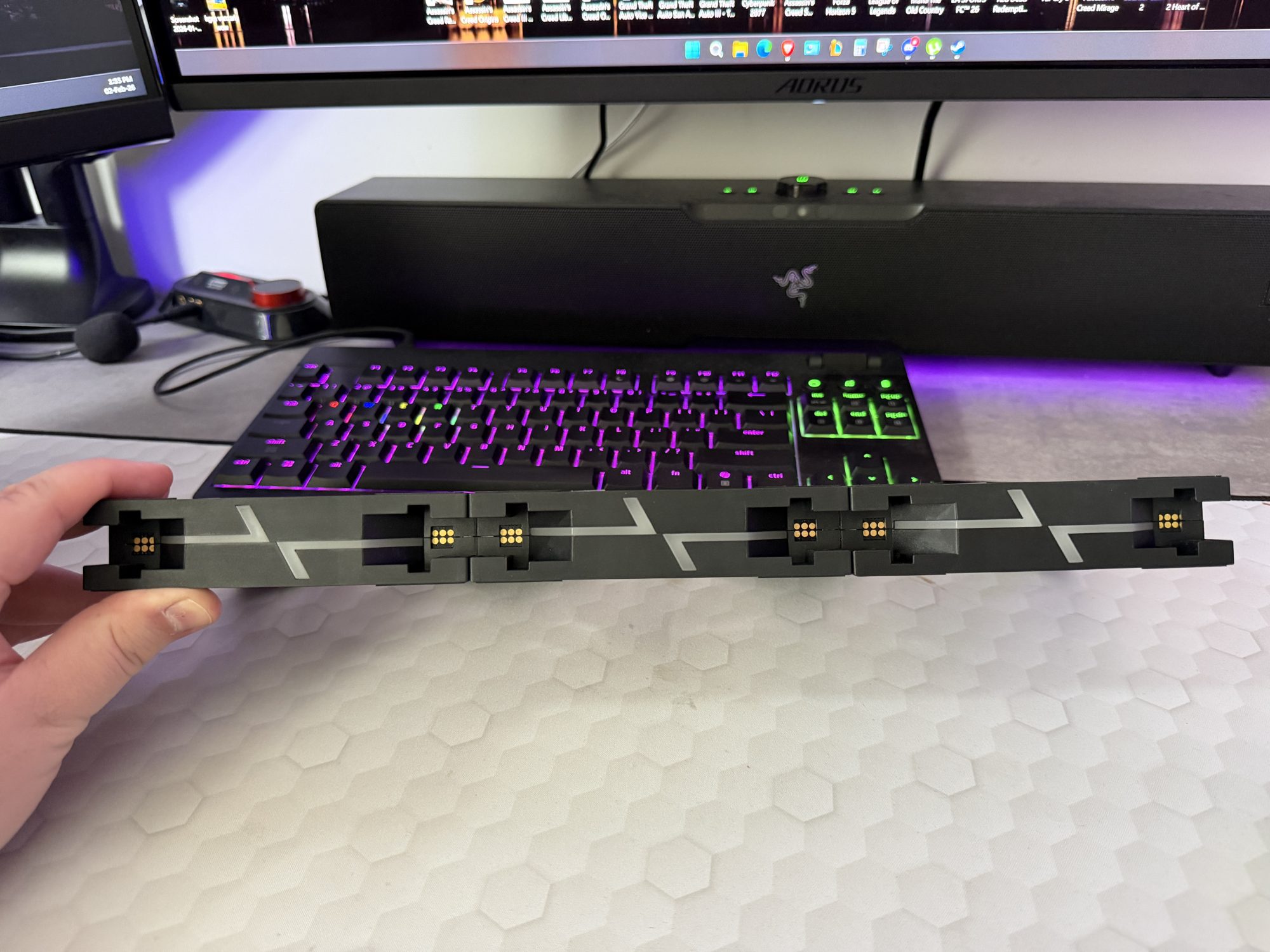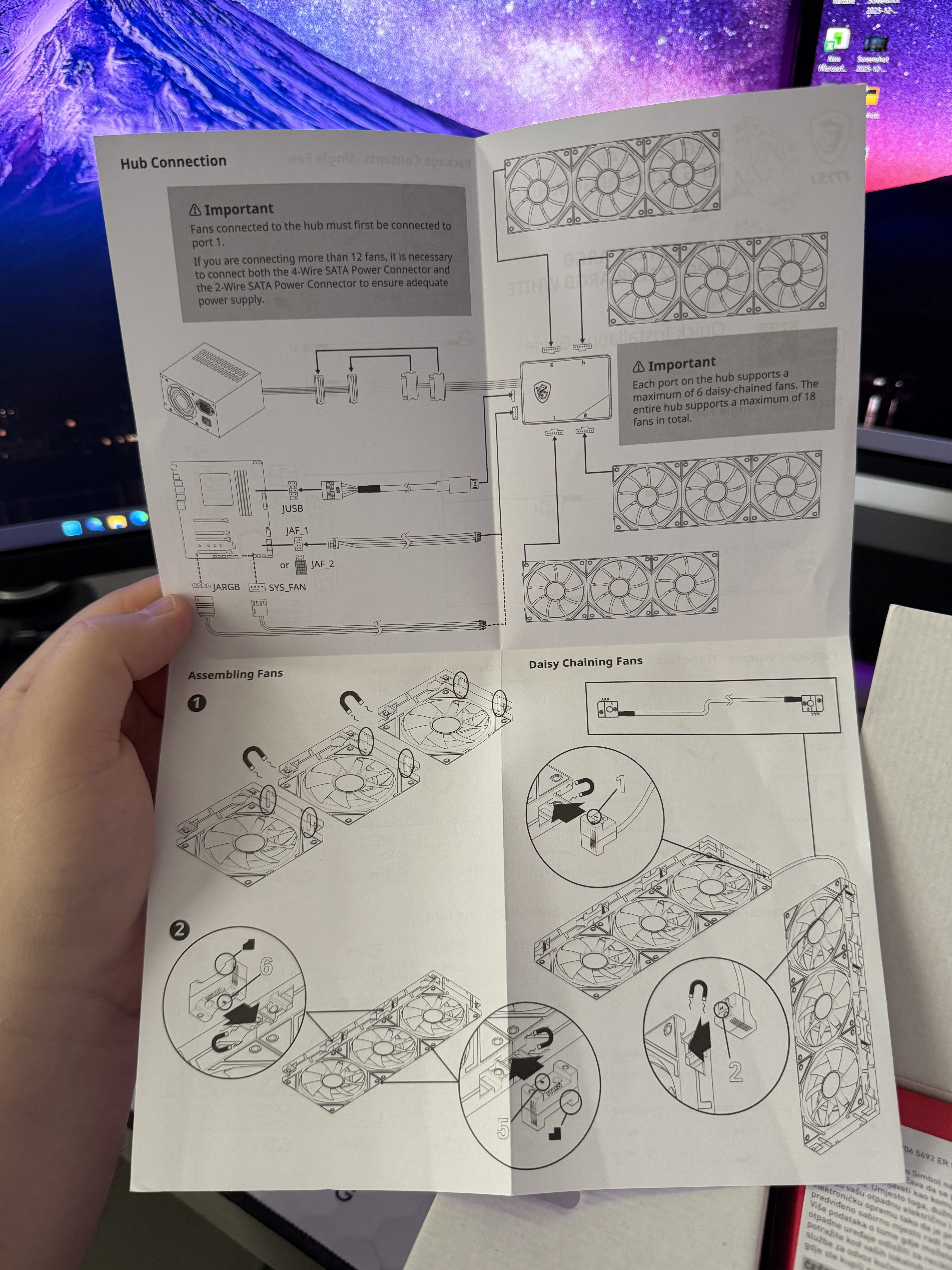 Diferența reală față de ventilatoare obișnuite este modul de conectare. Ventilatoarele se aliniază și se leagă între ele printr-un bloc de conectare magnetic, apoi merg către un hub. În practică, asta înseamnă mai puține cabluri individuale și un montaj mult mai rapid când ai mai multe ventilatoare în carcasă. Hub-ul are limitări clare: fiecare port suportă maximum 6 ventilatoare legate în lanț, iar hub-ul în total poate gestiona până la 18 ventilatoare. MSI menționează și un lucru important pentru cine face sisteme mari: dacă treci de 12 ventilatoare conectate, trebuie folosite ambele alimentări SATA ale hub-ului, ca să ai suficient curent.