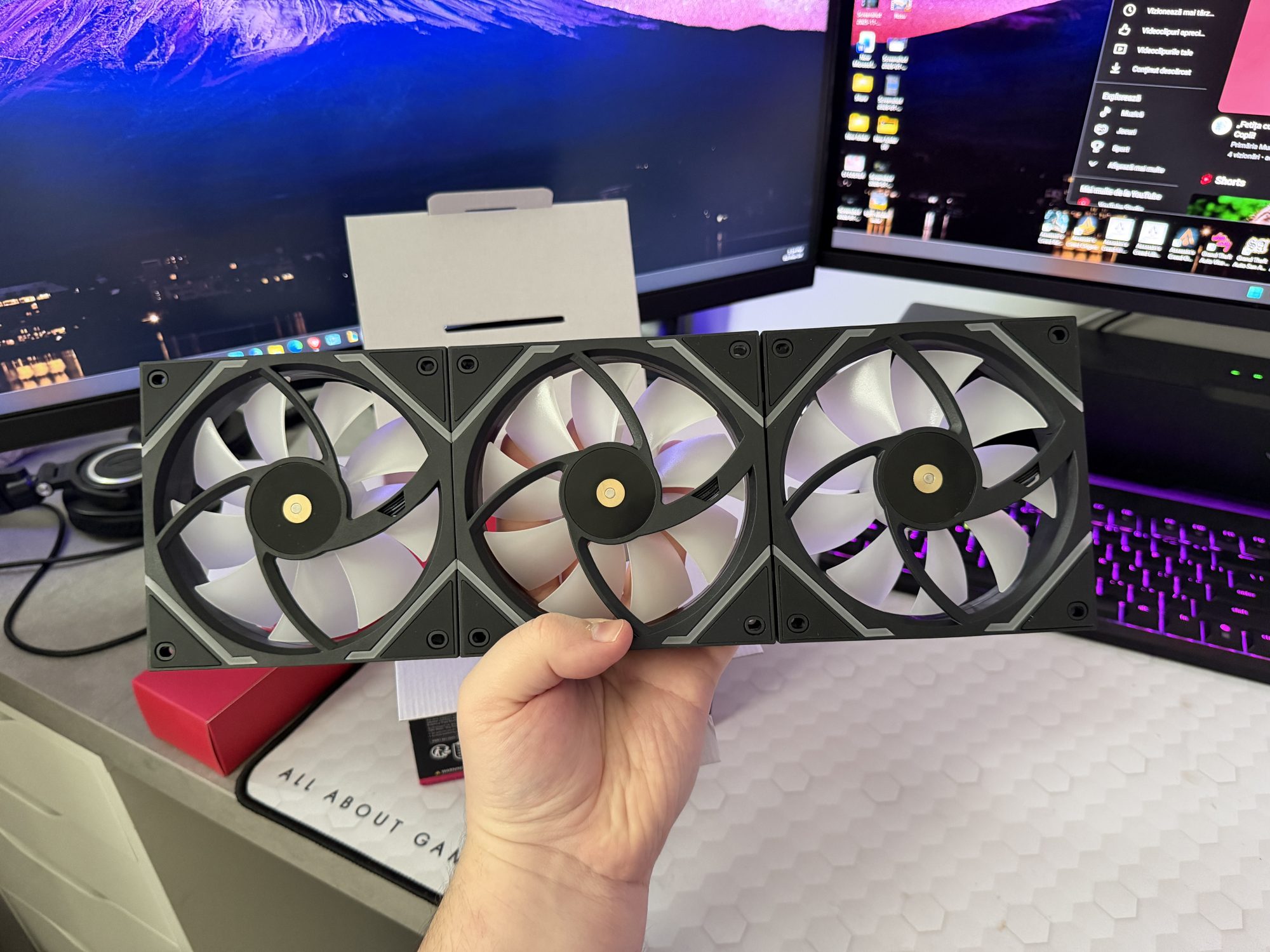 Partea de iluminare este serioasă pentru un kit de serie: 33 LED-uri ARGB per ventilator și control pe 3 zone pentru fiecare, ceea ce permite efecte mai elaborate decât un singur inel uniform. Alimentarea este clasică, 12V pentru motor și 5V pentru ARGB, deci trebuie atenție la header-ul corect de pe placa de bază, cel de 5V ARGB.