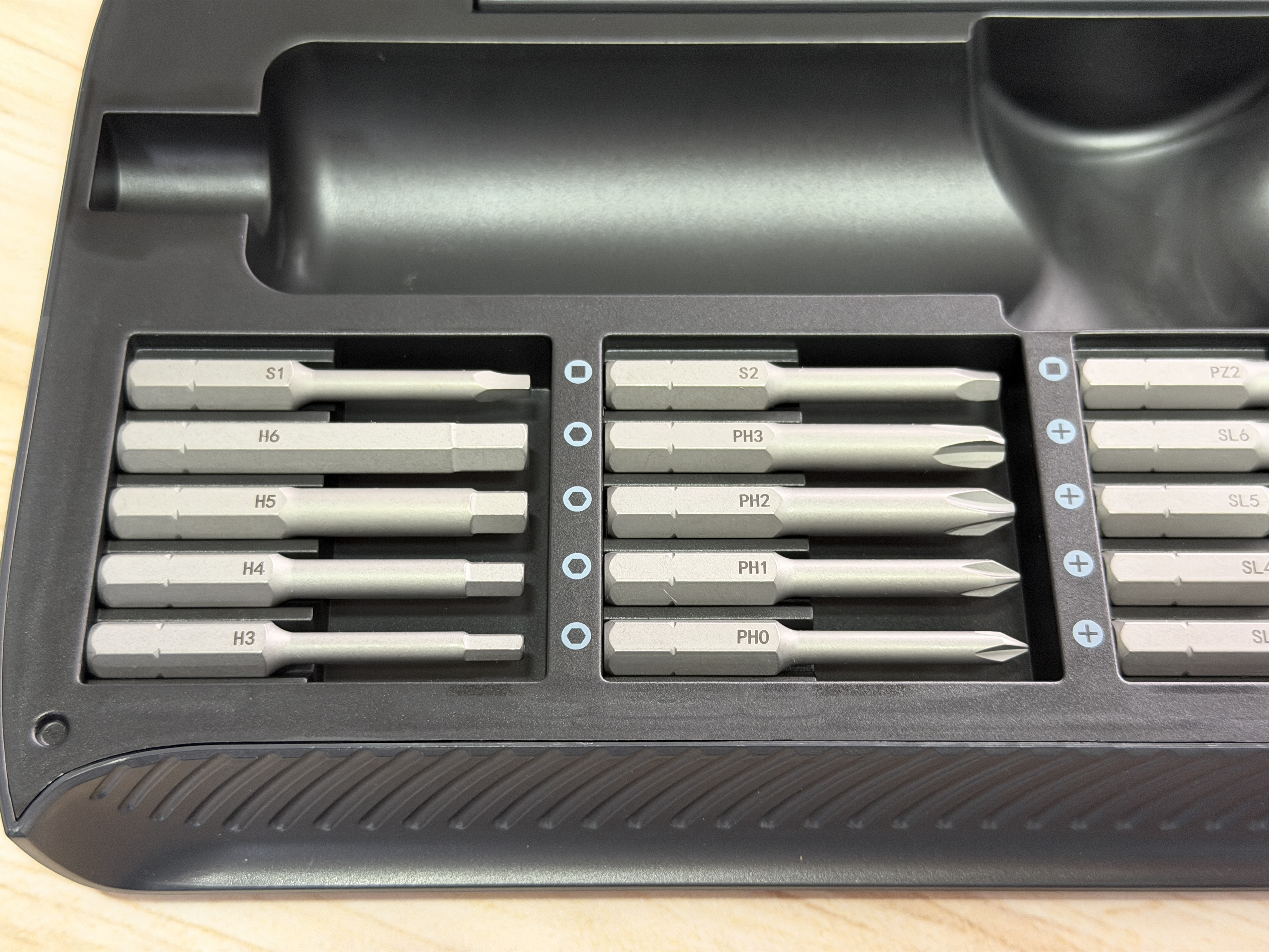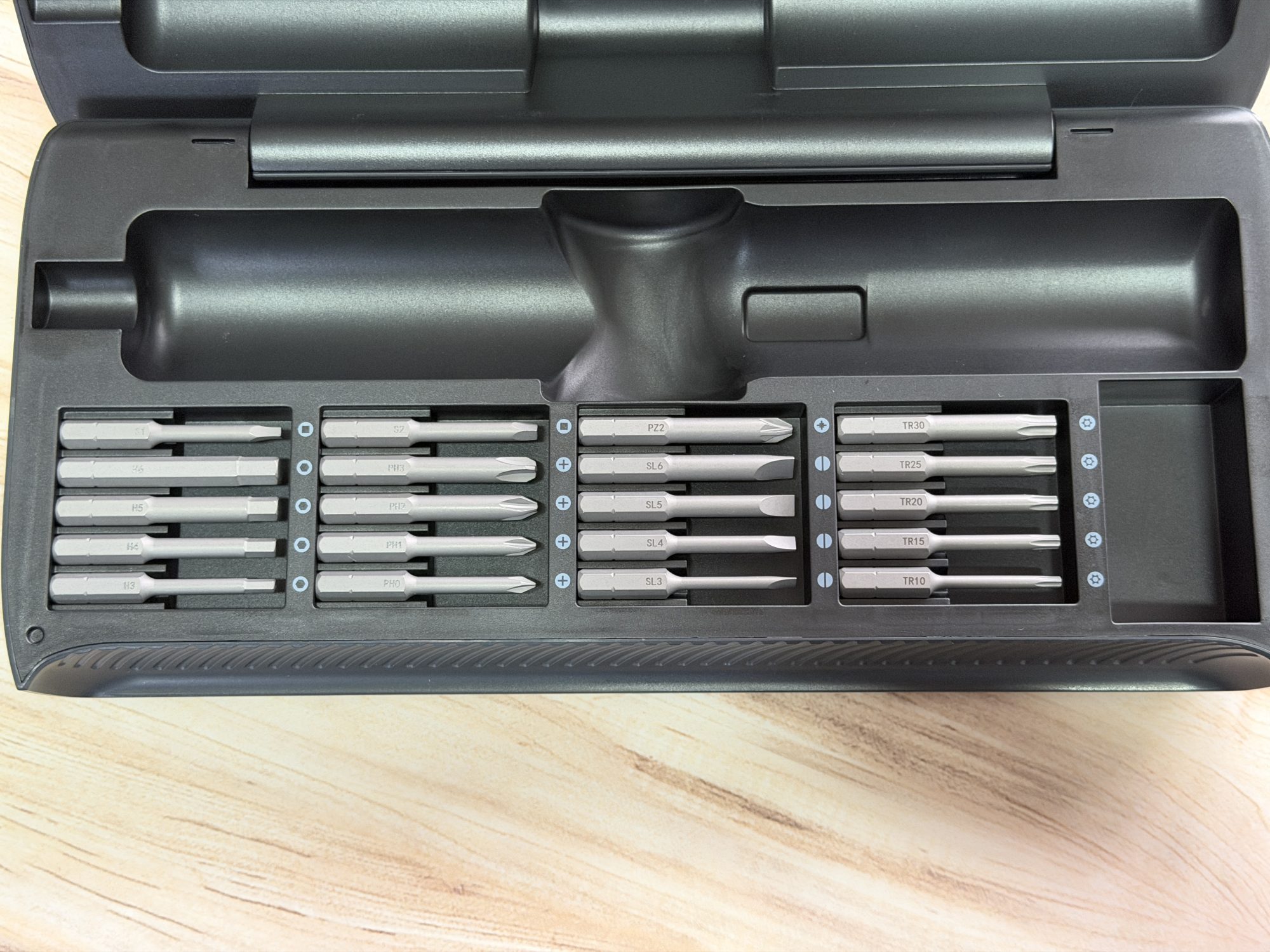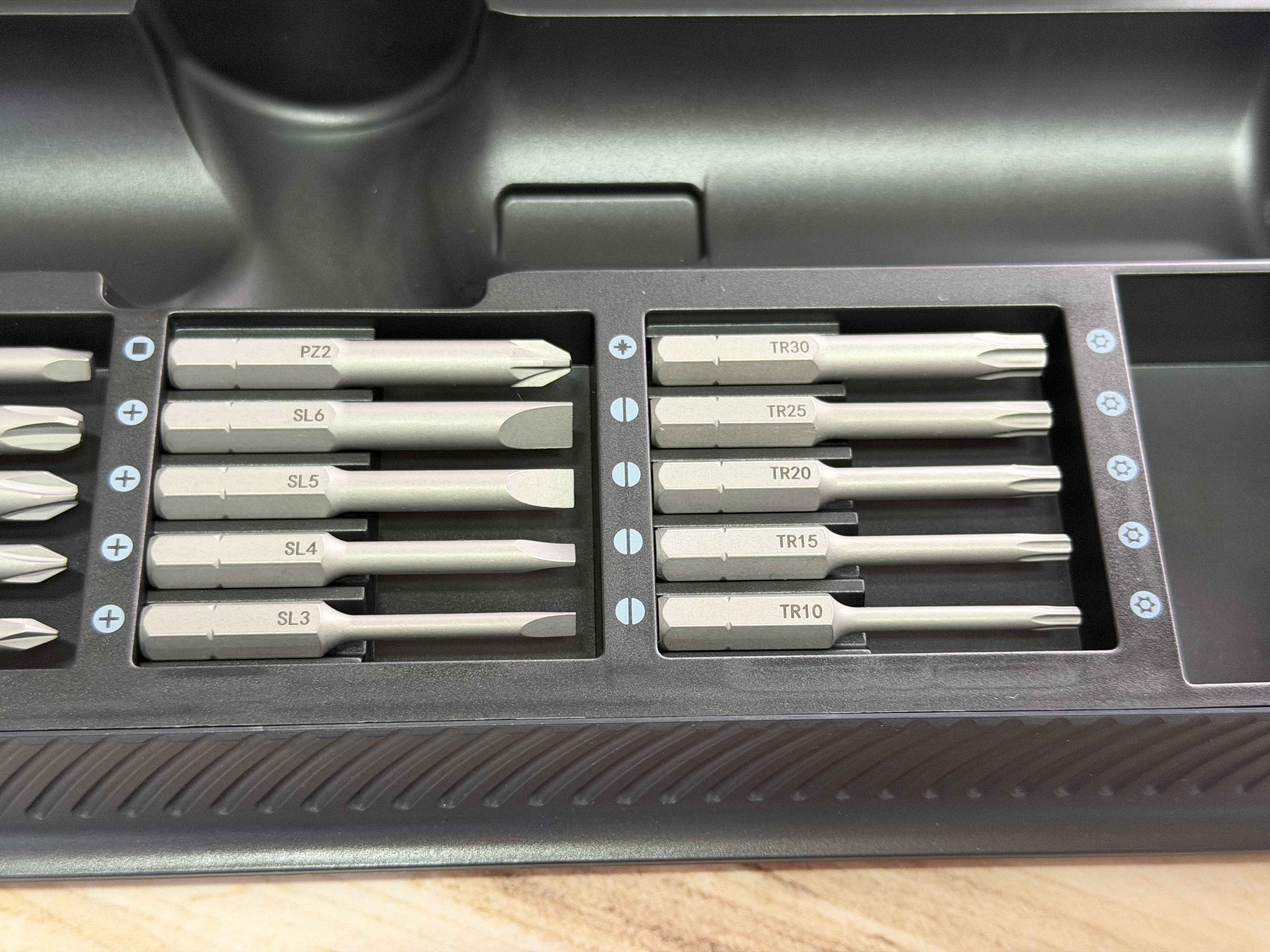 Din start, pachetul e complet. Primești o cutie de transport, cei 20 de biți și o șurubelniță care pare făcută pentru utilizare de zi cu zi, nu pentru vitrină. Construcția este în mare parte din plastic, dar e un plastic solid, cu o senzație bună în mână. Este ușoară, comodă și nu îți dă impresia că se va rupe la prima șurub mai încăpățânat.
