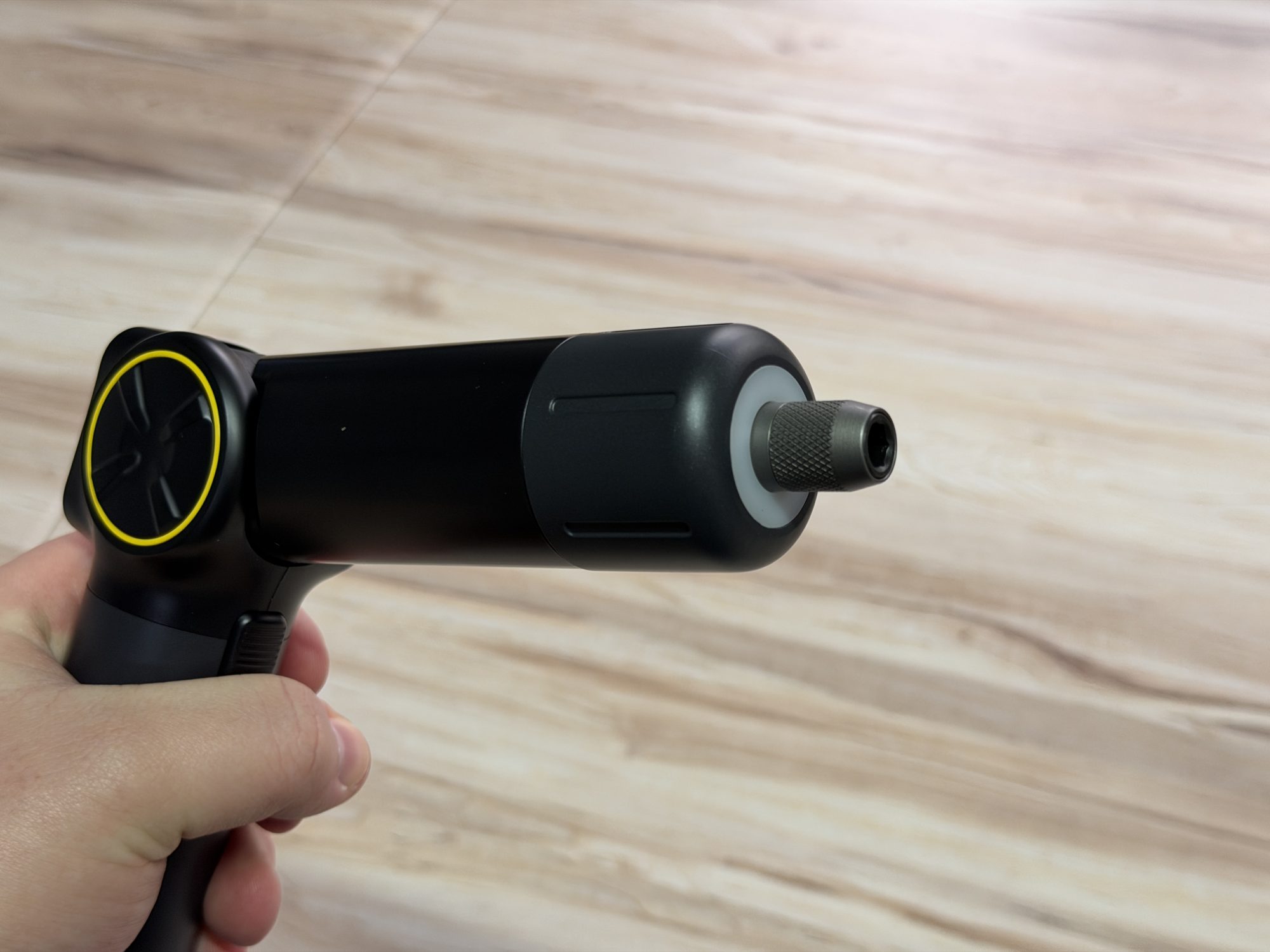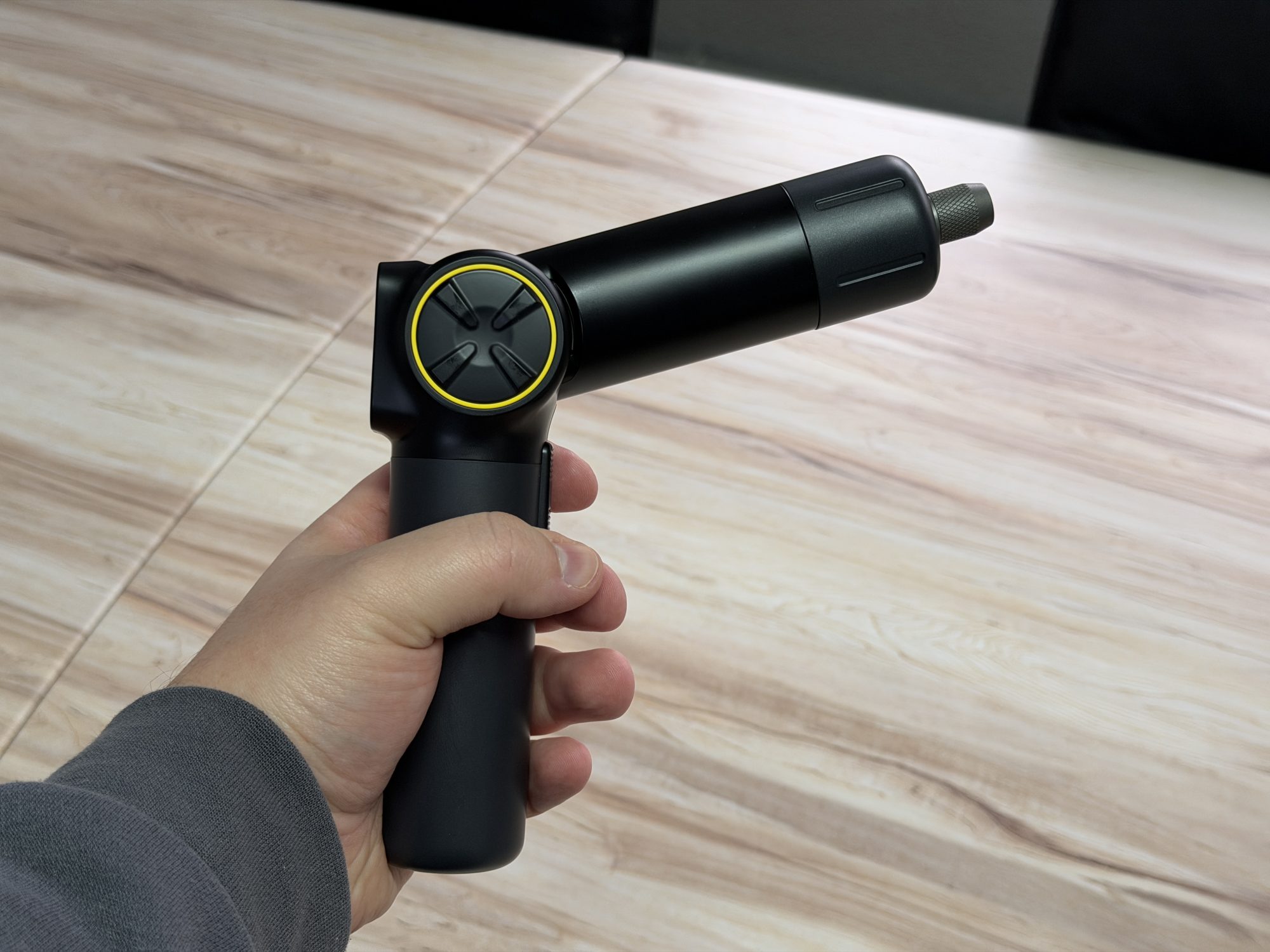 Piesa de rezistență este articulația din mijloc. Are un buton, iar când îl apeși poți schimba unghiul de lucru. O poți folosi dreaptă, ca o șurubelniță clasică, sau o poți îndoi la 90 de grade, ceea ce e genial când lucrezi prin spatele biroului, lângă carcasă, ori în colțuri unde nu ai spațiu să învârți mâna. Pe lângă asta, există și trepte intermediare, la 24, 48 și 72 de grade, care sunt surprinzător de utile în situațiile în care ai nevoie de o poziție mai naturală a încheieturii.