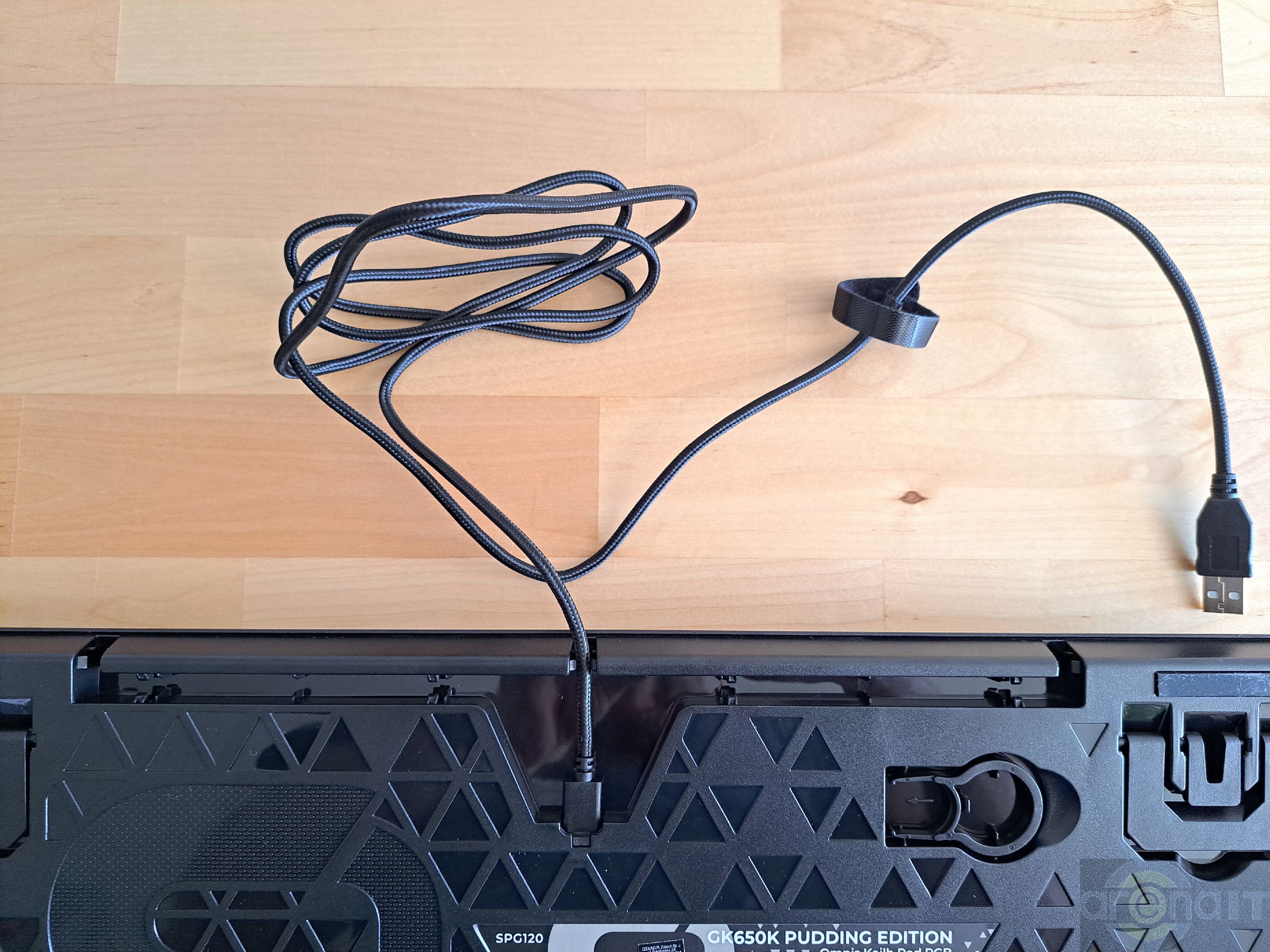 Cablul este detasabil si tastatura ofera 3 canale pentru a-i gestiona traseul. Cu ajutorul picioruselor de pe spate, inaltimea tastaturii poate fi reglata in 3 pozitii diferite. Tot pe partea din spate gasim si unealta pentru a scoate butoanele tastaturii. Cablul este imbracat intr-un material textil si are o lungime generoasa de 1.8m. Desi este detasabil (foloseste USB tip C pentru a se conecta la tastatura), tastatura nu este wireless.