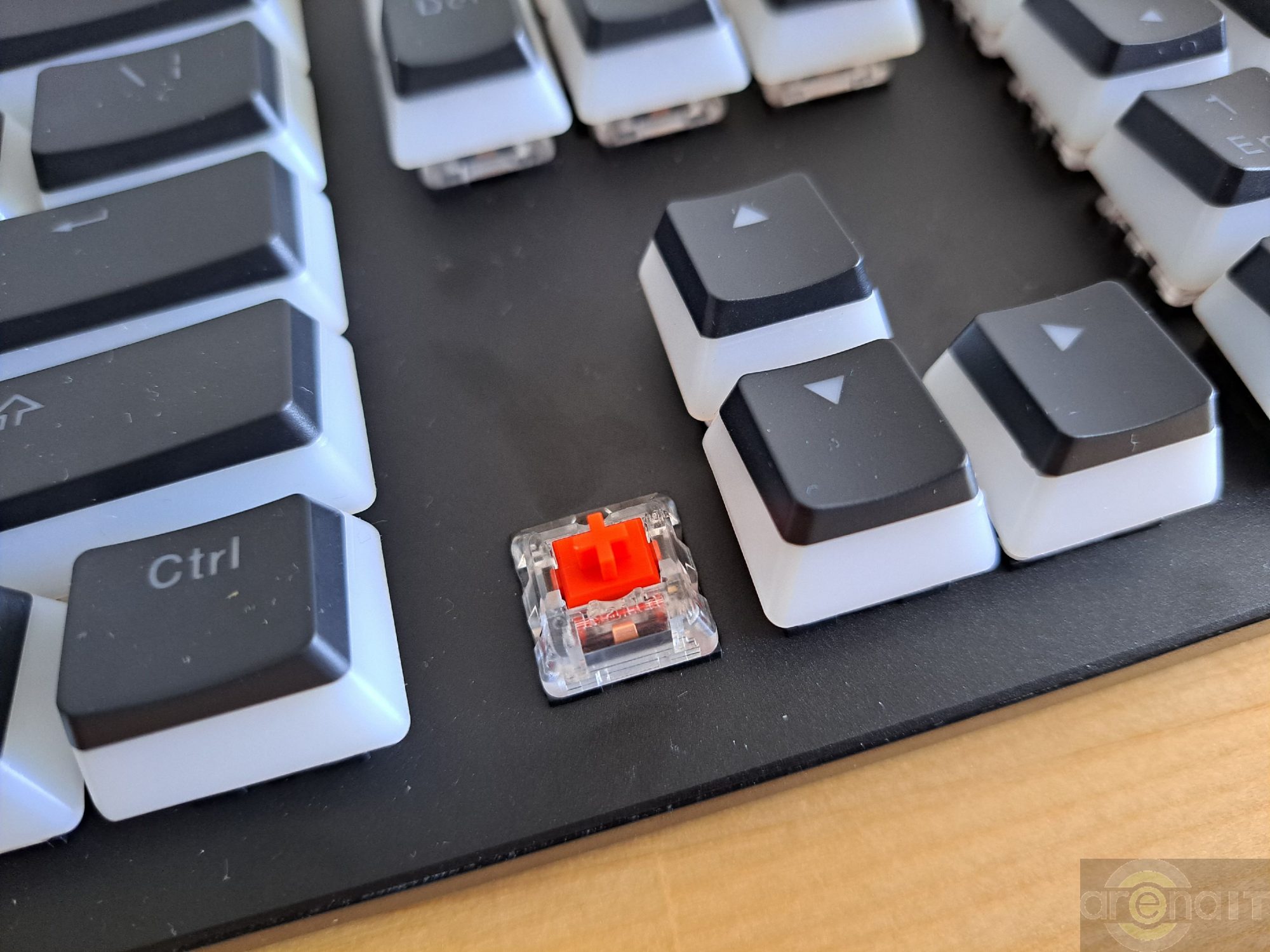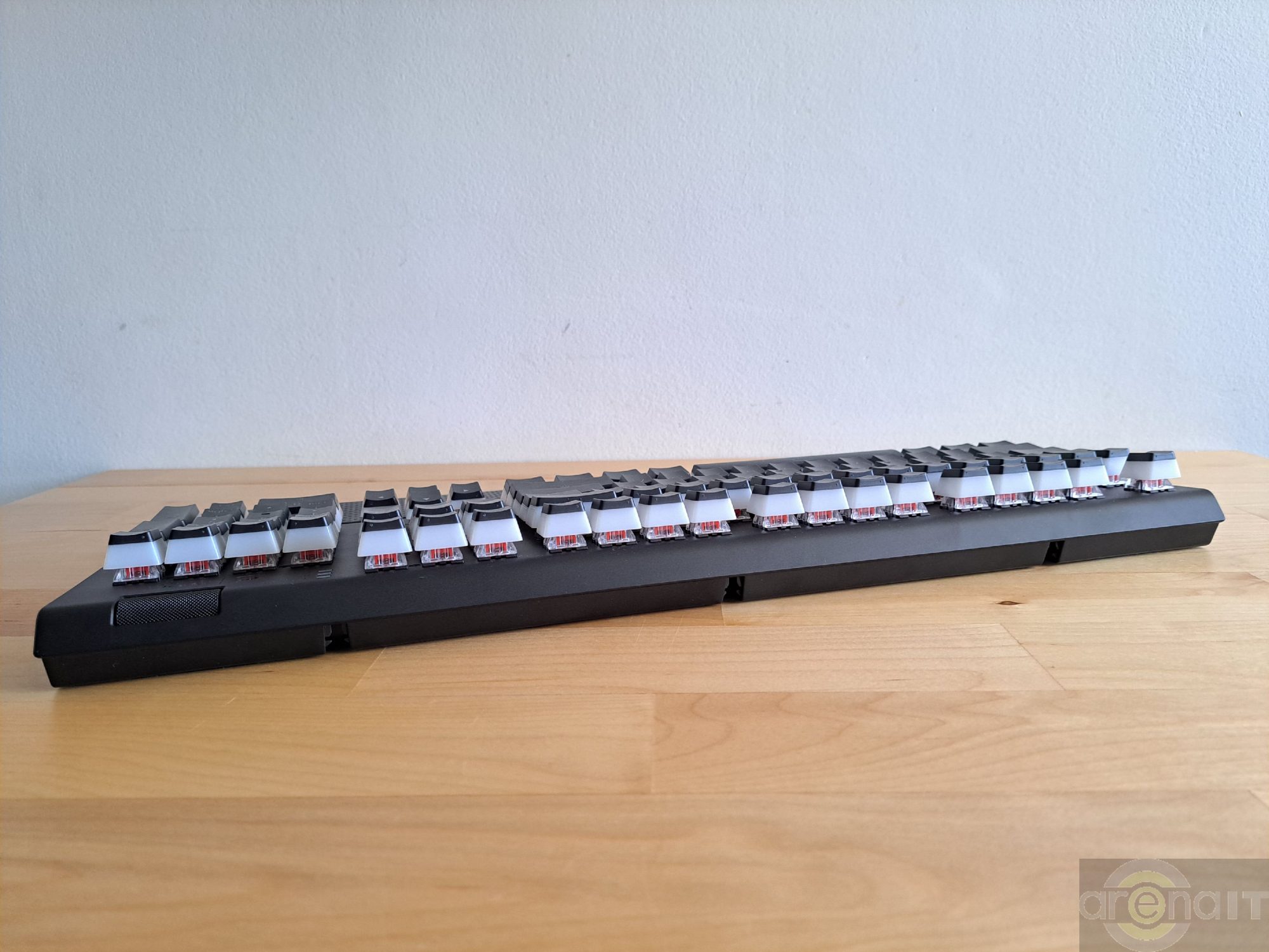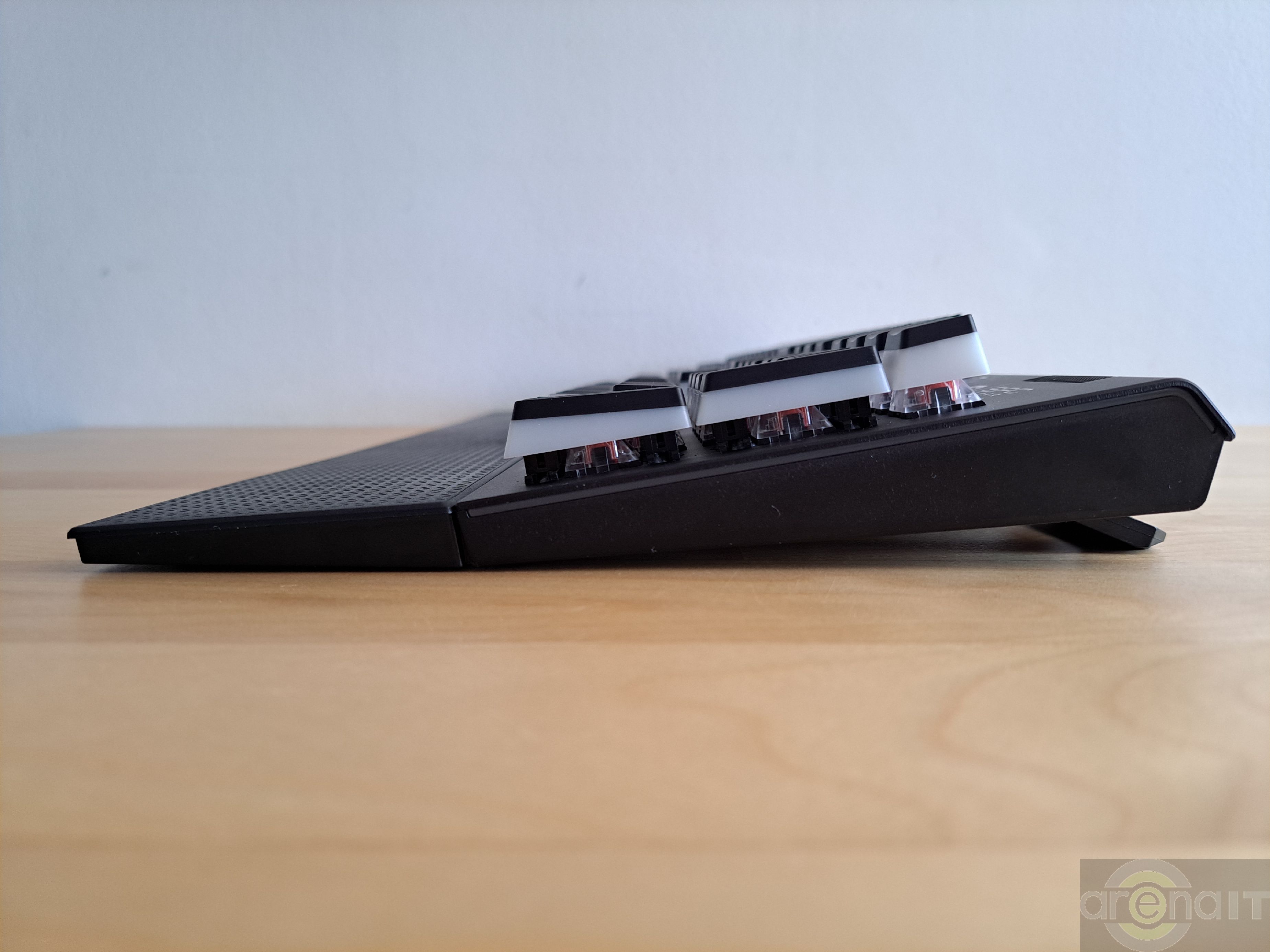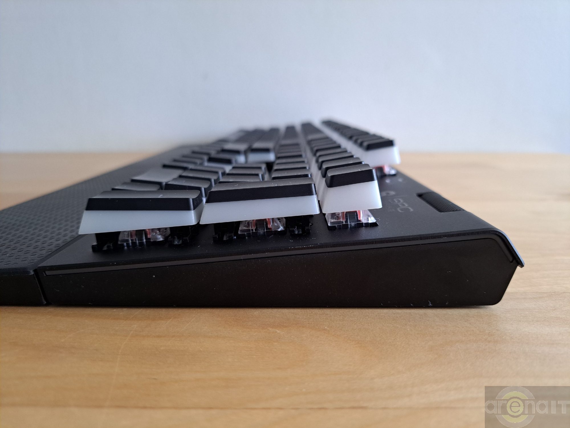 Switch-urile folosite de acest model sunt Kailh red. Acestea sunt liniare, foarte „linistite” in materie de zgomot produs si cu o cursa de 3.6mm. Trecand de la o tastatura echipata cu Cherry MX Red la acest model am avut nevoie de cam 15 minute pana m-am obisnuit cu feedback-ul transmis si cu nivelul scazut de zgomot al tastelor. Desi tot ce tastam era citit, aveam impresia ca nu sunt tastate toate caracterele datorita feedback-ului auditiv mult mai scazut pe care am ajuns sa il prefer dupa o utilizare indelungata.