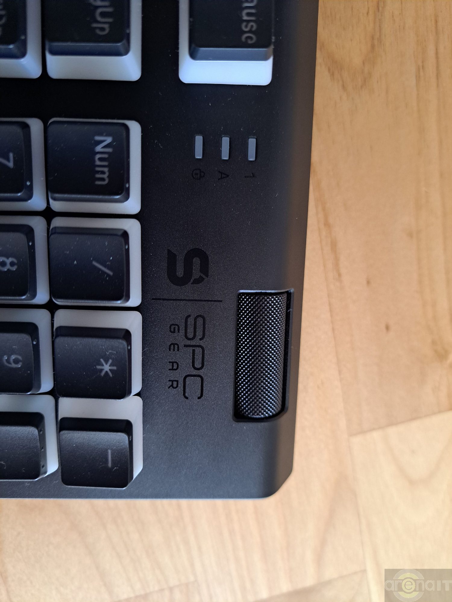 In primul rand este o tastatura mecanica de dimensiuni complete cu 104 taste, incluzand si tastatura numerica. Designul este industrial, iar butoanele iti lasa impresia ca plutesc deasupra placii din aluminiu cu un finisaj mat placut la atingere. Pe lateral au fost inserate niste benzi RGB discrete pentru a lumina ambiental biroul, avem 3 LED-uri cu lumina alba pentru numlock, capslock si gaming mode (Win lock). Rotita de volum aflata langa LED-uri transmite un feedback tactil pentru fiecare treapta si prezinta nervuri astfel incat utilizarea ei se face cu precizie.