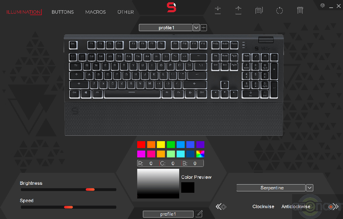 Pentru butoanele tastaturii se poate alege un mod de functionare predefinit din cele 18 prezente, la care se poate configura viteza, intensitatea luminii si directia (stanga-dreapta sau dreapta-stanga) sau se poate opta pentru un mod personalizat.